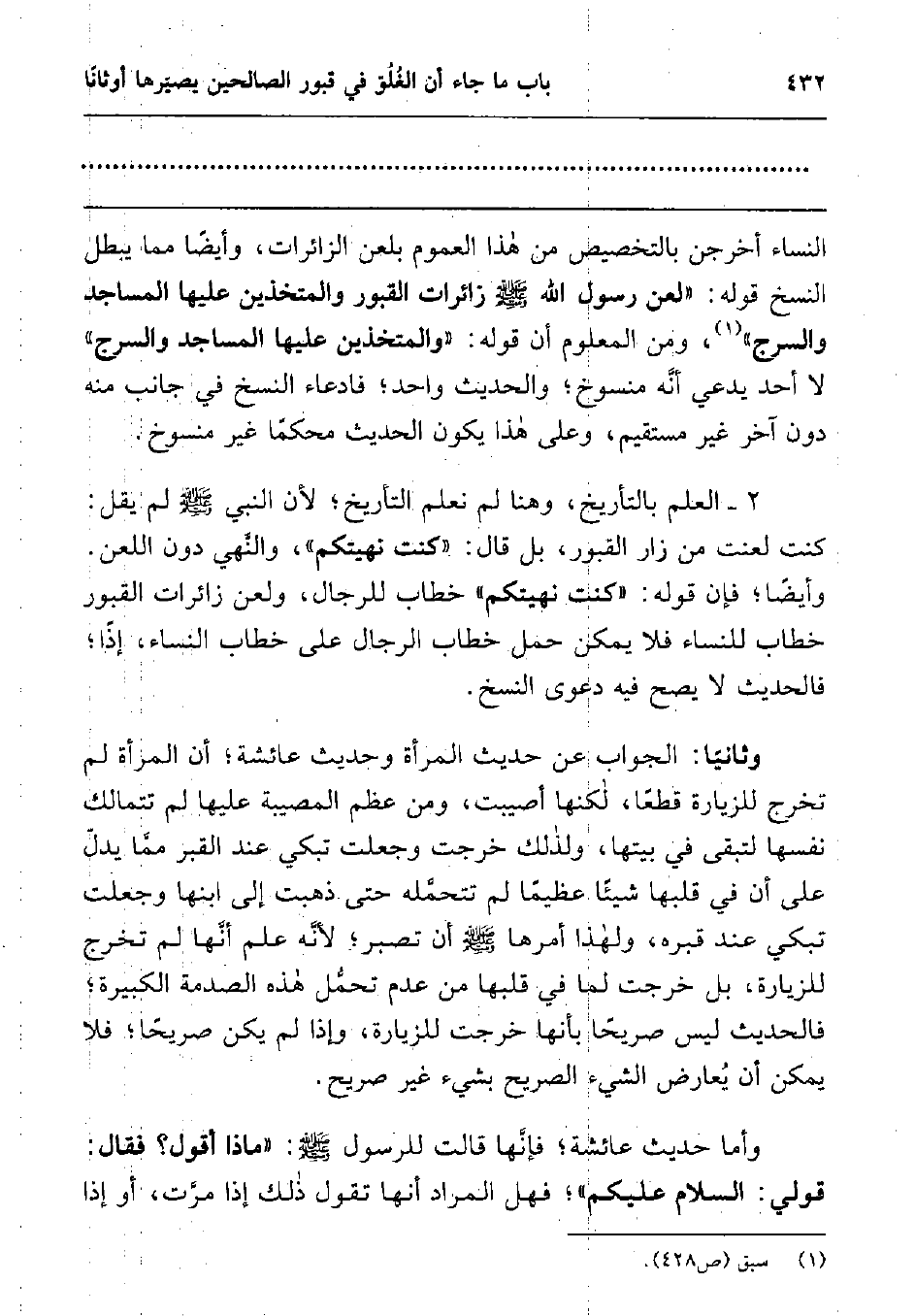 النساء أخرجن بالتخصيص من هذا العموم بلعن الزائرات، وأيضا مما يبطل النسخ قوله: " لعن رسول الله صلى الله عليه وسلم زائرات القبور والمتخذين عليها المساجد والسرج "1 ومن المعلوم أن قوله:" والمتخذين عليها المساجد والسرج " لا أحد يدعي أنه منسوخ; والحديث واحد; فادعاء النسخ في جانب منه دون آخر غير مستقيم، وعلى هذا يكون الحديث محكما غير منسوخ.
