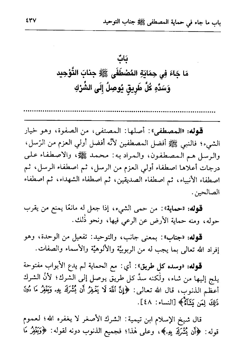 باب ما جاء في حماية المصطفى صلى الله عليه وسلم جناب التوحيد وسده كل طريق يوصل إلى الشرك
