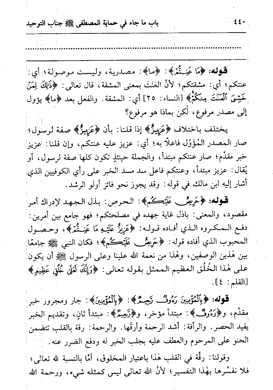 والفعل بعد "ما" يؤول إلى مصدر مرفوع، لكن بماذا هو مرفوع؟ يختلف باختلاف "عزيز" إذا قلنا: بأن "عزيز" صفة لرسول; صار المصدر المؤول فاعلا به; أي: عزيز عليه عنتكم، وإن قلنا: عزيز خبر مقدم; صار عنتكم مبتدأ، والجملة حينئذ تكون كلها صفة لرسول، أو يقال: عزيز مبتدأ، وعنتكم فاعل سد مسد الخبر على رأي الكوفيين الذي أشار إليه ابن مالك في قوله: