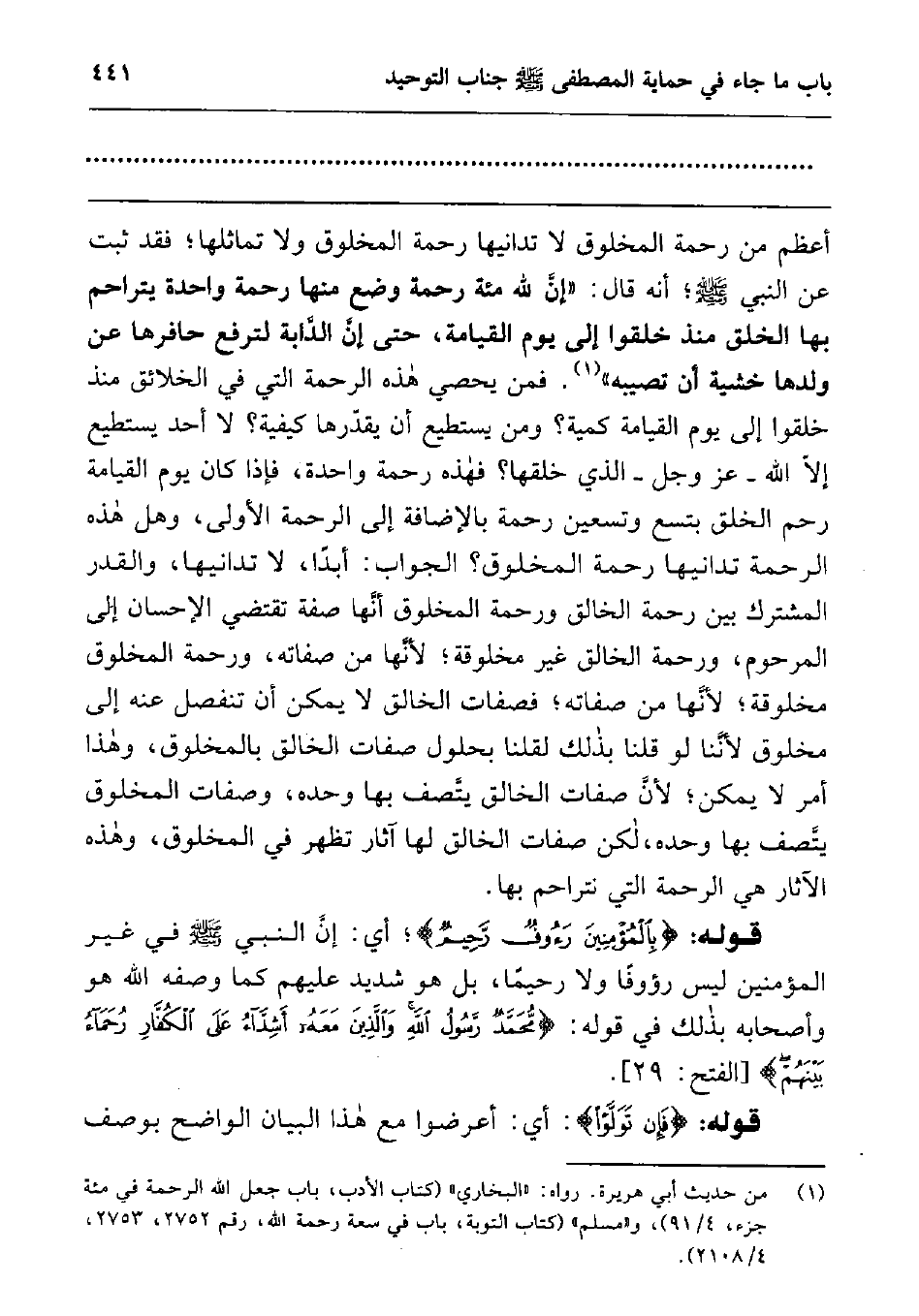 1 من حديث أبي هريرة. رواه: "البخاري" (كتاب الأدب, باب جعل الله الرحمة في مئة جزء, 4/91) , و "مسلم" (كتاب التوبة, باب في سعة رحمة الله, رقم 2752, 2753, 4/2108) .