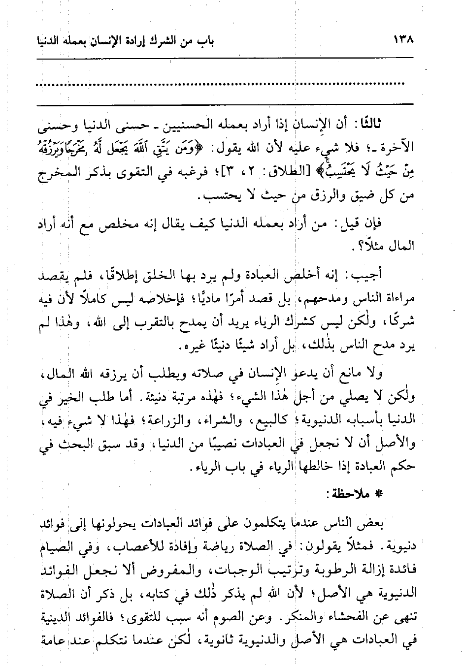 ثالثا: أن الإنسان إذا أراد بعمله الحسنيين- حسنى الدنيا، وحسنى الآخرة-; فلا شيء عليه لأن الله يقول: {وَمَنْ يَتَّقِ اللَّهَ يَجْعَلْ لَهُ مَخْرَجاً وَيَرْزُقْهُ مِنْ حَيْثُ لا يَحْتَسِبُ} ، [الطلاق: من الآية2-3] ، فرغبه في التقوى بذكر المخرج من كل ضيق والرزق من حيث لا يحتسب.