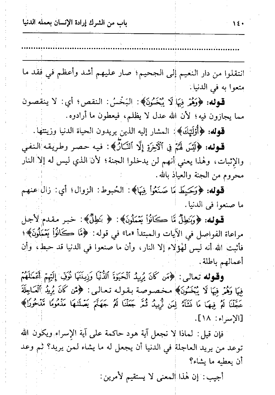 وقوله تعالى: {مَنْ كَانَ يُرِيدُ الْحَيَاةَ الدُّنْيَا وَزِينَتَهَا نُوَفِّ إِلَيْهِمْ أَعْمَالَهُمْ فِيهَا وَهُمْ فِيهَا لا يُبْخَسُونَ} ، مخصوصة بقوله تعالى: {مَنْ كَانَ يُرِيدُ الْعَاجِلَةَ عَجَّلْنَا لَهُ فِيهَا مَا نَشَاءُ لِمَنْ نُرِيدُ ثُمَّ جَعَلْنَا لَهُ جَهَنَّمَ يَصْلاهَا مَذْمُوماً مَدْحُوراً} ، [الإسراء:18] .
