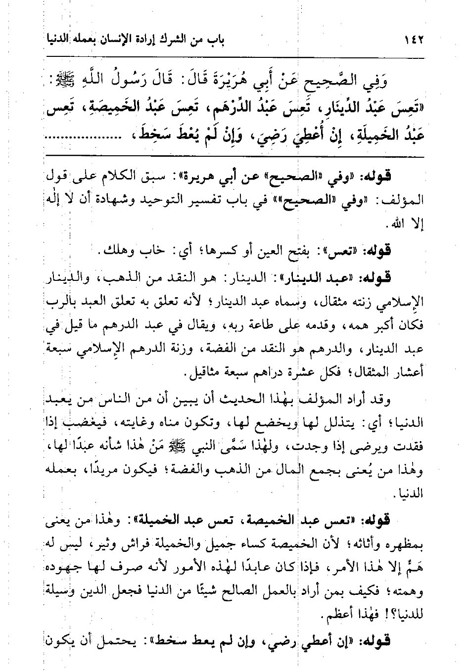 وفي الصحيح عن أبي هريرة قال: قال رسول الله صلى الله عليه وسلم (تعس عبد الدينار، تعس عبد الدرهم، تعس عبد الخميصة، تعس عبد الخميلة، إن أعطي رضي، وإن لم يعط سخط......................................