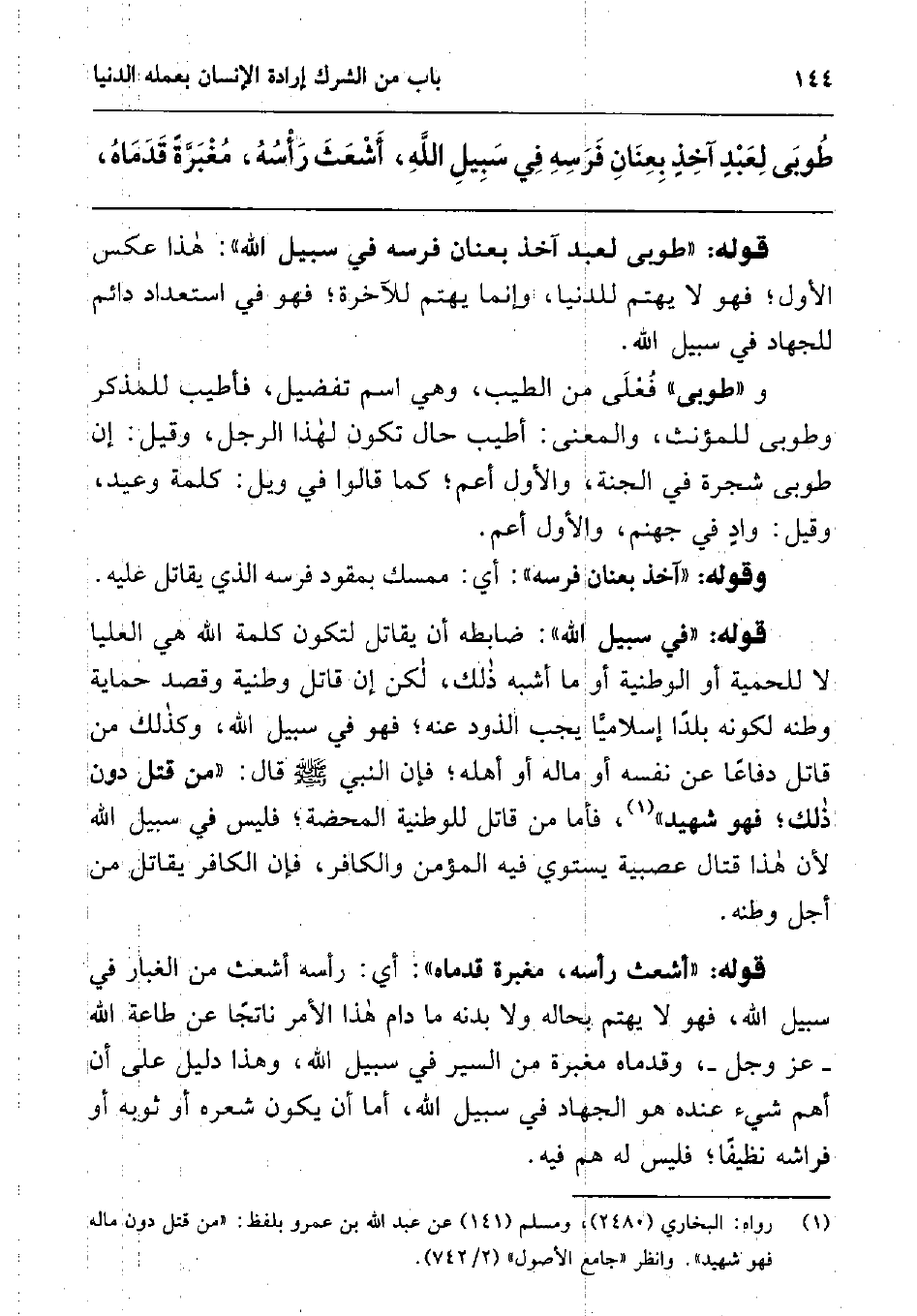 قوله: (طوبى لعبد آخذ بعنان فرسه في سبيل الله (: هذا عكس الأول; فهو لا يهتم للدنيا، وإنما يهتم للآخرة; فهو في استعداد دائم للجهاد في سبيل الله.