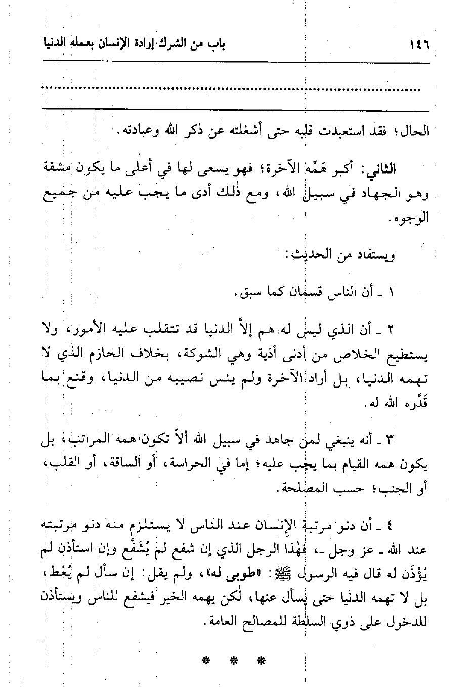 3- أنه ينبغي لمن جاهد في سبيل الله ألا تكون همه المراتب، بل يكون همه القيام بما يجب عليه; إما في الحراسة، أو الساقة، أو القلب، أو الجنب; حسب المصلحة.