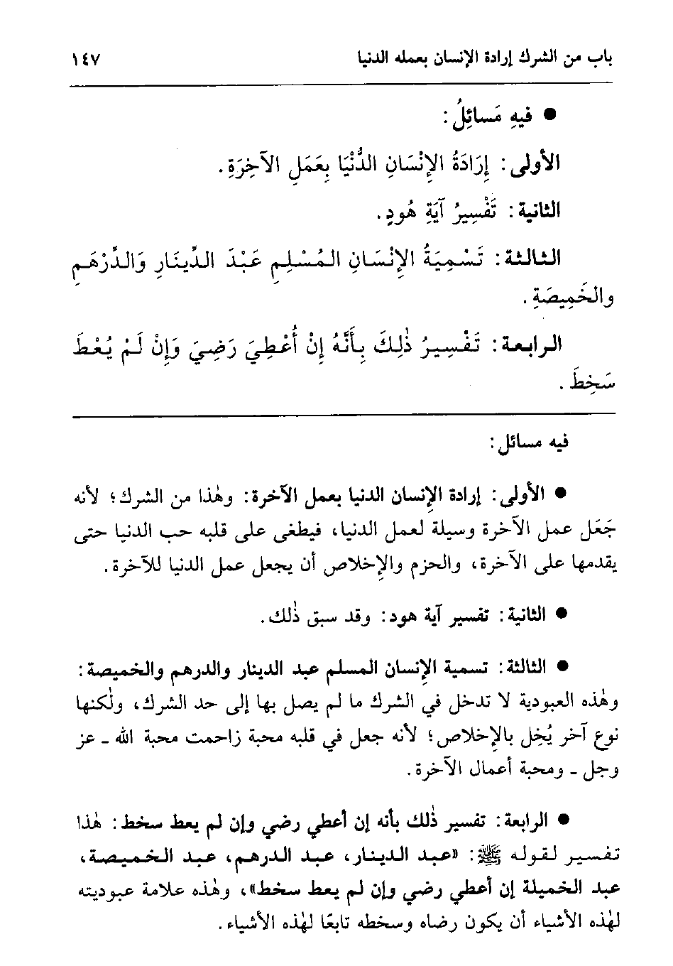 الأولى: إرادة الإنسان الدنيا بعمل الآخرة: وهذا من الشرك; لأنه جعل عمل الآخرة وسيلة لعمل الدنيا، فيطغى على قلبه حب الدنيا حتى يقدمها على الآخرة، والحزم والإخلاص أن يجعل عمل الدنيا للآخرة.