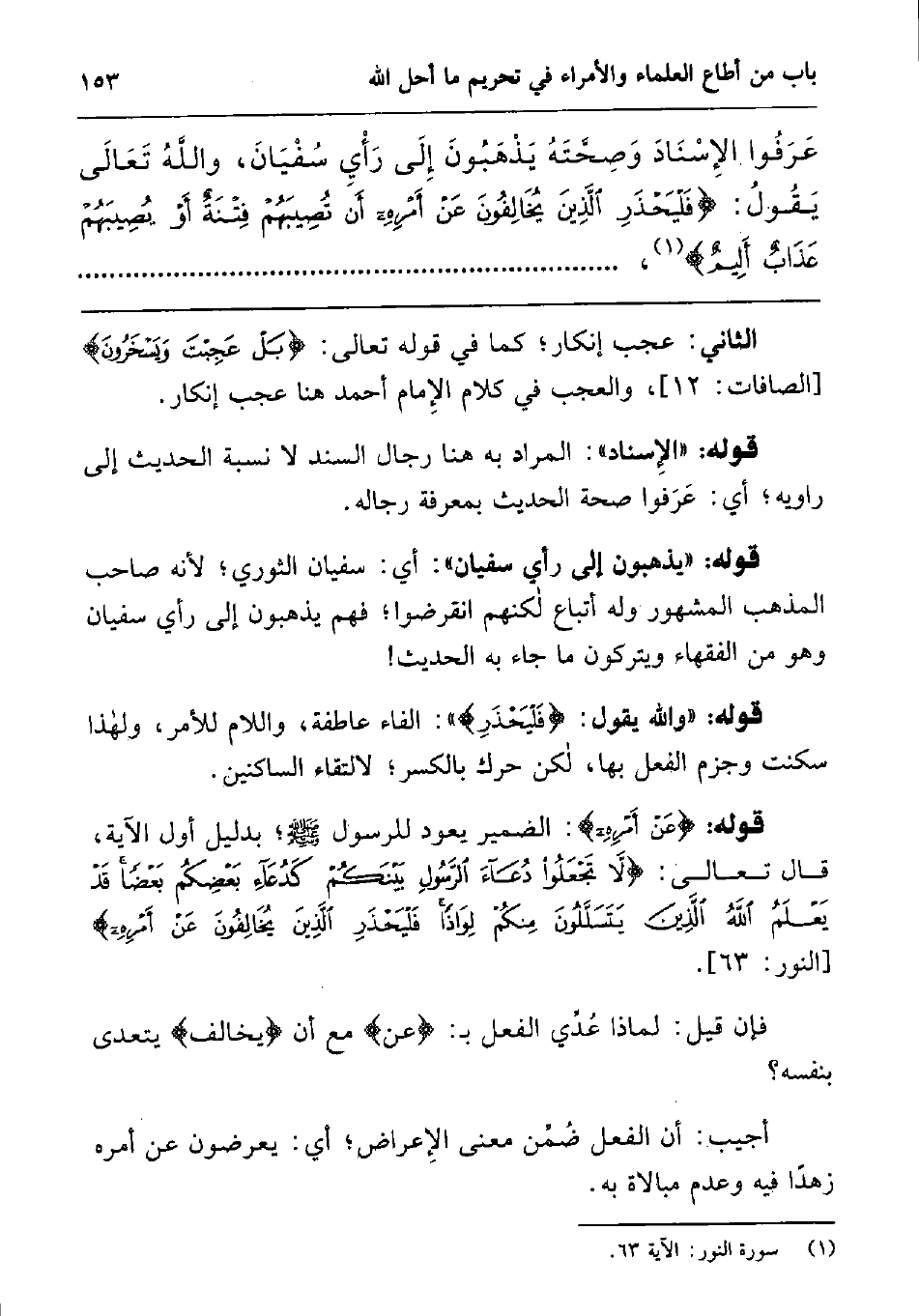 عرفوا الإسناد وصحته يذهبون إلى رأي سفيان، والله تعالى يقول: {فَلْيَحْذَرِ الَّذِينَ يُخَالِفُونَ عَنْ أَمْرِهِ أَنْ تُصِيبَهُمْ فِتْنَةٌ أَوْ يُصِيبَهُمْ عَذَابٌ أَلِيمٌ} ، [النور: من الآية63] ،..............................................
