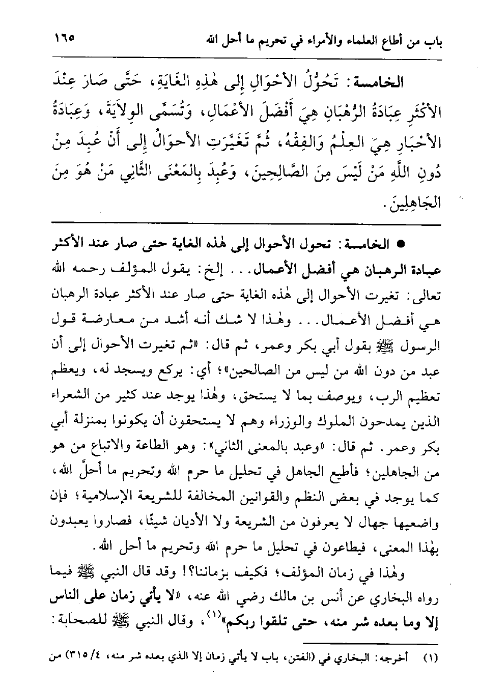 الخامسة: تحول الأحوال إلى هذه الغاية؛ حتى صار عند الأكثر عبادة الرهبان هي أفضل الأعمال ... إلخ: يقول المؤلف رحمه الله تعالى: تغيرت الأحوال إلى هذه الغاية؛ حتى صار عند الأكثر: عبادة الرهبان هي أفضل الأعمال ... ، وهذا لا شك أنه أشد من معارضة قول الرسول (بقول أبي بكر وعمر، ثم قال: " ثم تغيرت الأحوال إلى أن عبد من دون الله من ليس من الصالحين"; أي: يركع ويسجد له، ويعظم تعظيم الرب، ويوصف بما لا يستحق، وهذا يوجد عند كثير من الشعراء الذين يمدحون الملوك والوزراء وهم لا يستحقون أن يكونوا بمنزلة أبي بكر وعمر.
