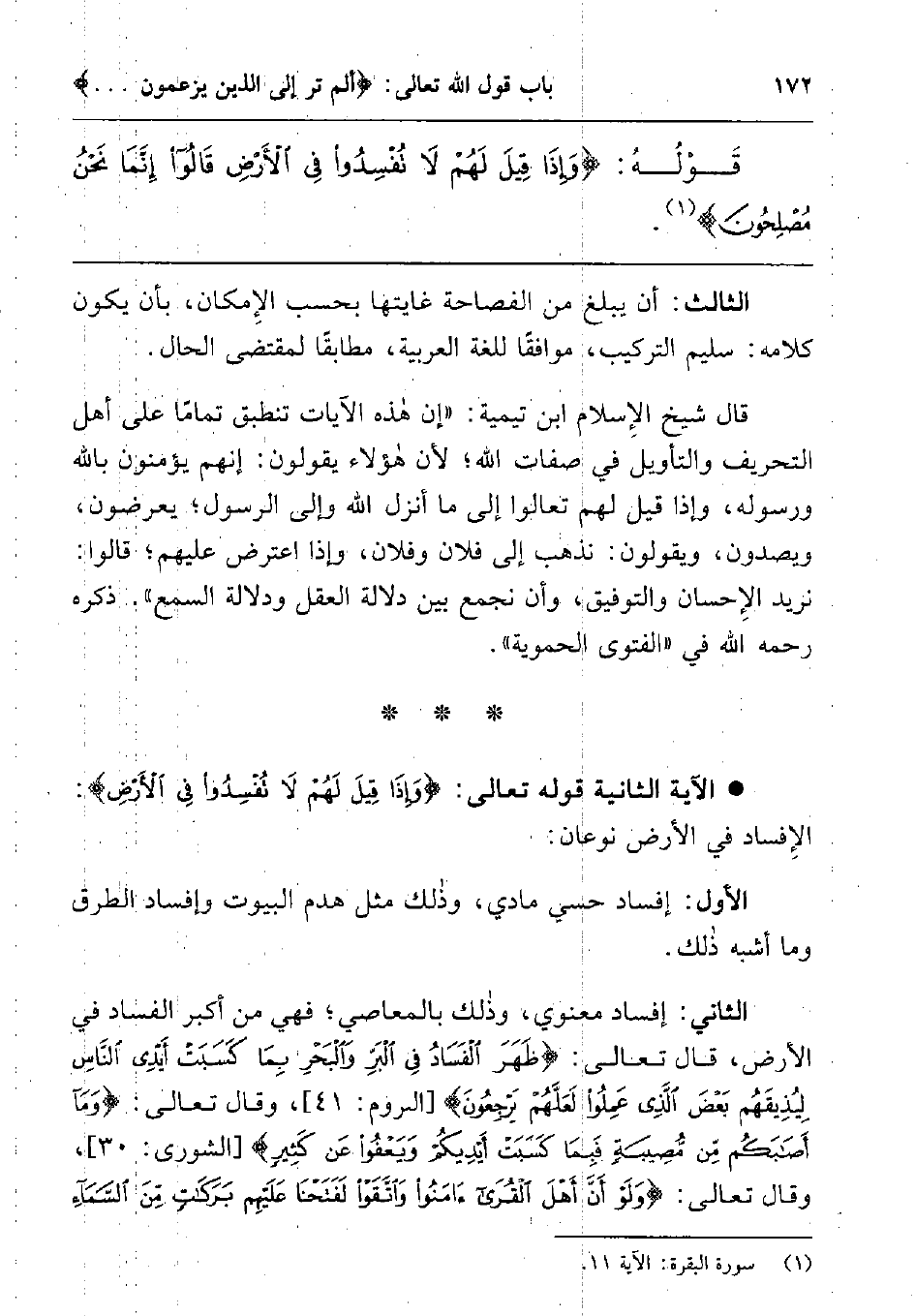 قوله: {وَإِذَا قِيلَ لَهُمْ لا تُفْسِدُوا فِي الْأَرْضِ قَالُوا إِنَّمَا نَحْنُ مُصْلِحُونَ} ، [البقرة:11] .