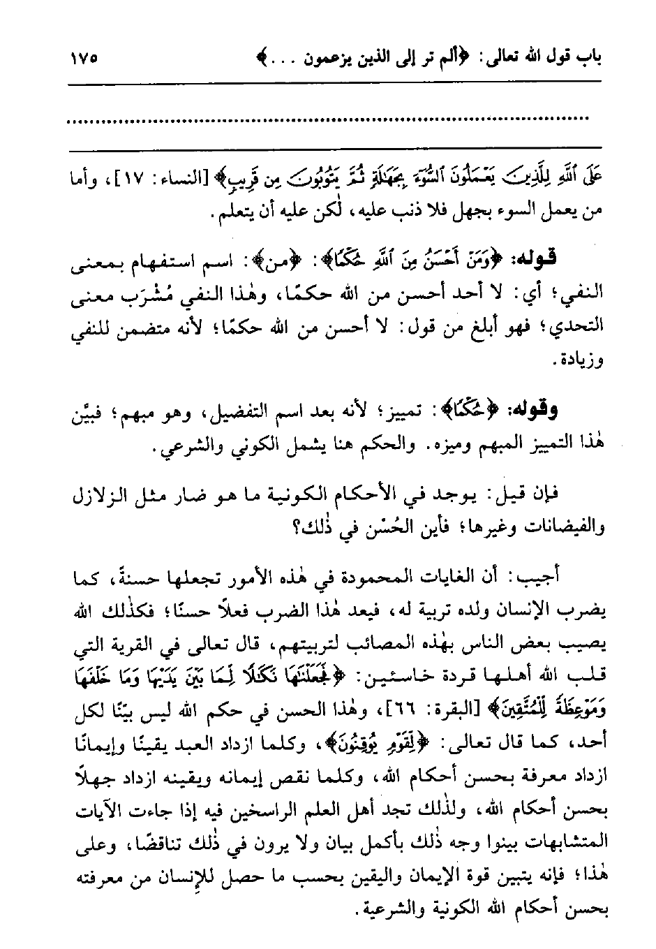 عَلَى اللَّهِ لِلَّذِينَ يَعْمَلُونَ السُّوءَ بِجَهَالَةٍ ثُمَّ يَتُوبُونَ مِنْ قَرِيبٍ} ، [النساء: من الآية17] ، وأما من يعمل السوء بجهل فلا ذنب عليه، لكن عليه أن يتعلم. قوله: {وَمَنْ أَحْسَنُ مِنَ اللَّهِ حُكْماً} ، "من": اسم استفهام بمعنى النفي; أي: لا أحد أحسن من الله حكما، وهذا النفي مشرب معنى التحدي; فهو أبلغ من قول: لا أحسن من الله حكما; لأنه متضمن للنفي وزيادة.
