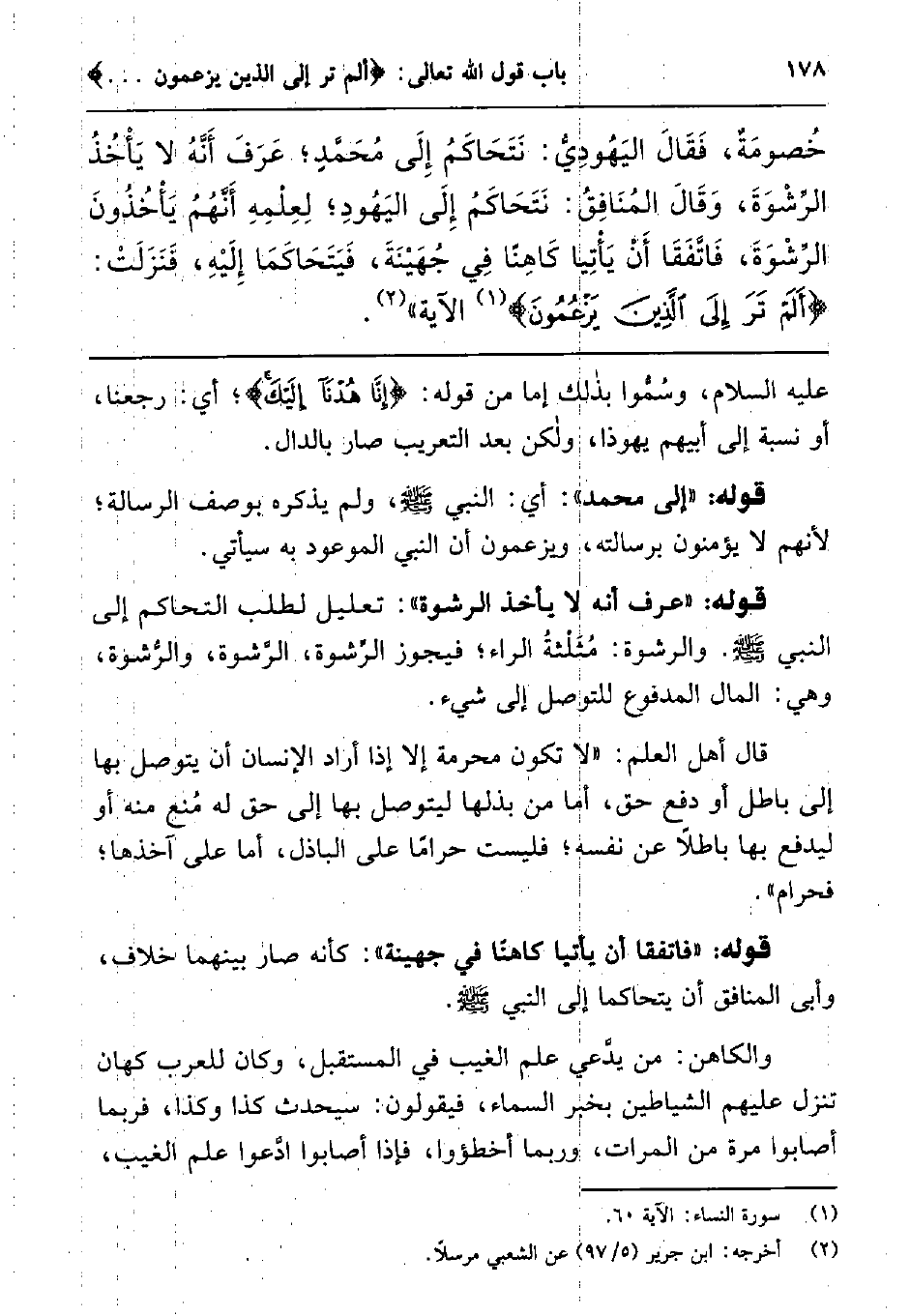 خصومة، فقال اليهودي: نتحاكم إلى محمد; عرف أنه لا يأخذ الرشوة، وقال المنافق: نتحاكم إلى اليهود; لعلمه أنهم يأخذون الرشوة، فاتفقا أن يأتيا كاهنا في جهينة، فيتحاكما إليه، فنزلت: {أَلَمْ تَرَ إِلَى الَّذِينَ يَزْعُمُونَ} ، الآية، [النساء: من الآية60] "1.
