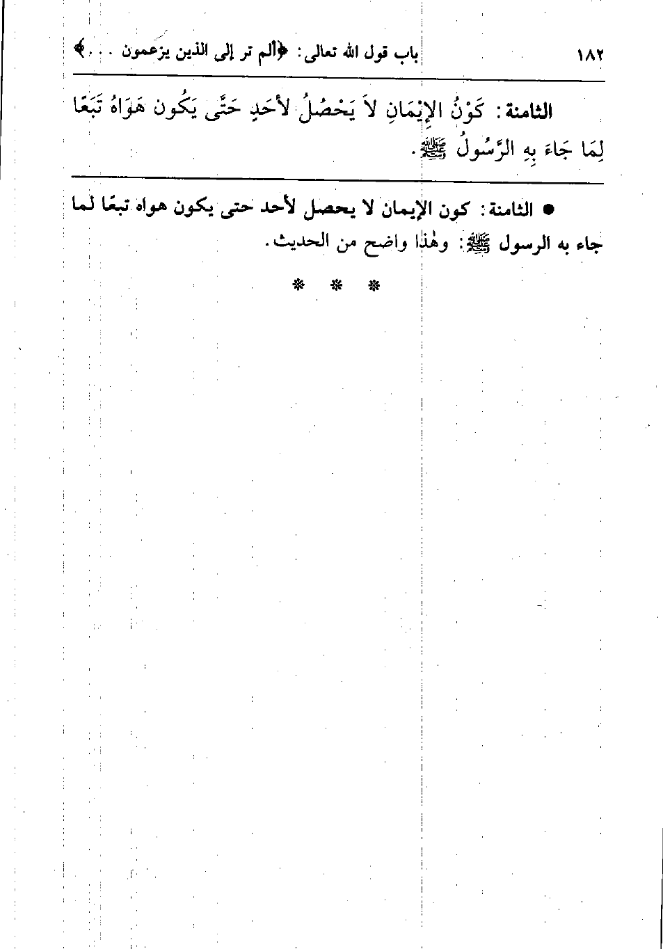 الثامنة: كون الأيمان لا يحصل لأحد حتى يكون هواه تبعا لما جاء به الرسول صلى الله عليه وسلم وهذا واضح من الحديث.