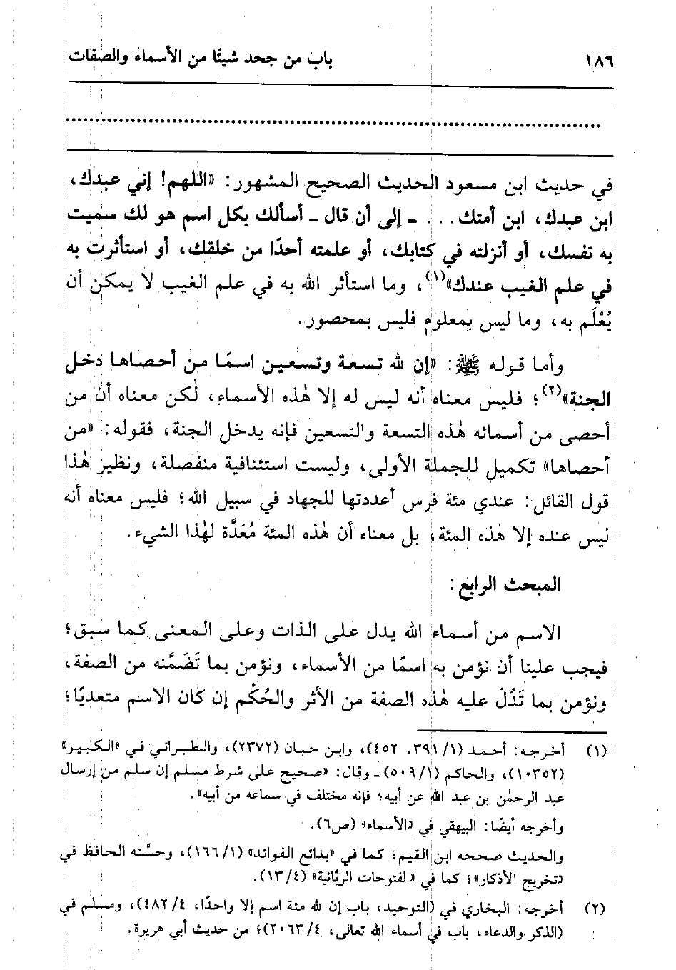 وأما قوله صلى الله عليه وسلم: " إن لله تسعة وتسعين اسما من أحصاها دخل الجنة "2، فليس معناه أنه ليس له إلا هذه الأسماء، لكن معناه أن من أحصى من أسمائه هذه التسعة والتسعين فإنه يدخل الجنة، فقوله: "من أحصاها" تكميل للجملة الأولى، وليست استئنافية منفصلة، ونظير هذا قول القائل: عندي مئة فرس أعددتها للجهاد في سبيل الله; فليس معناه أنه ليس عنده إلا هذه المئة، بل معناه أن هذه المئة معدة لهذا الشيء.