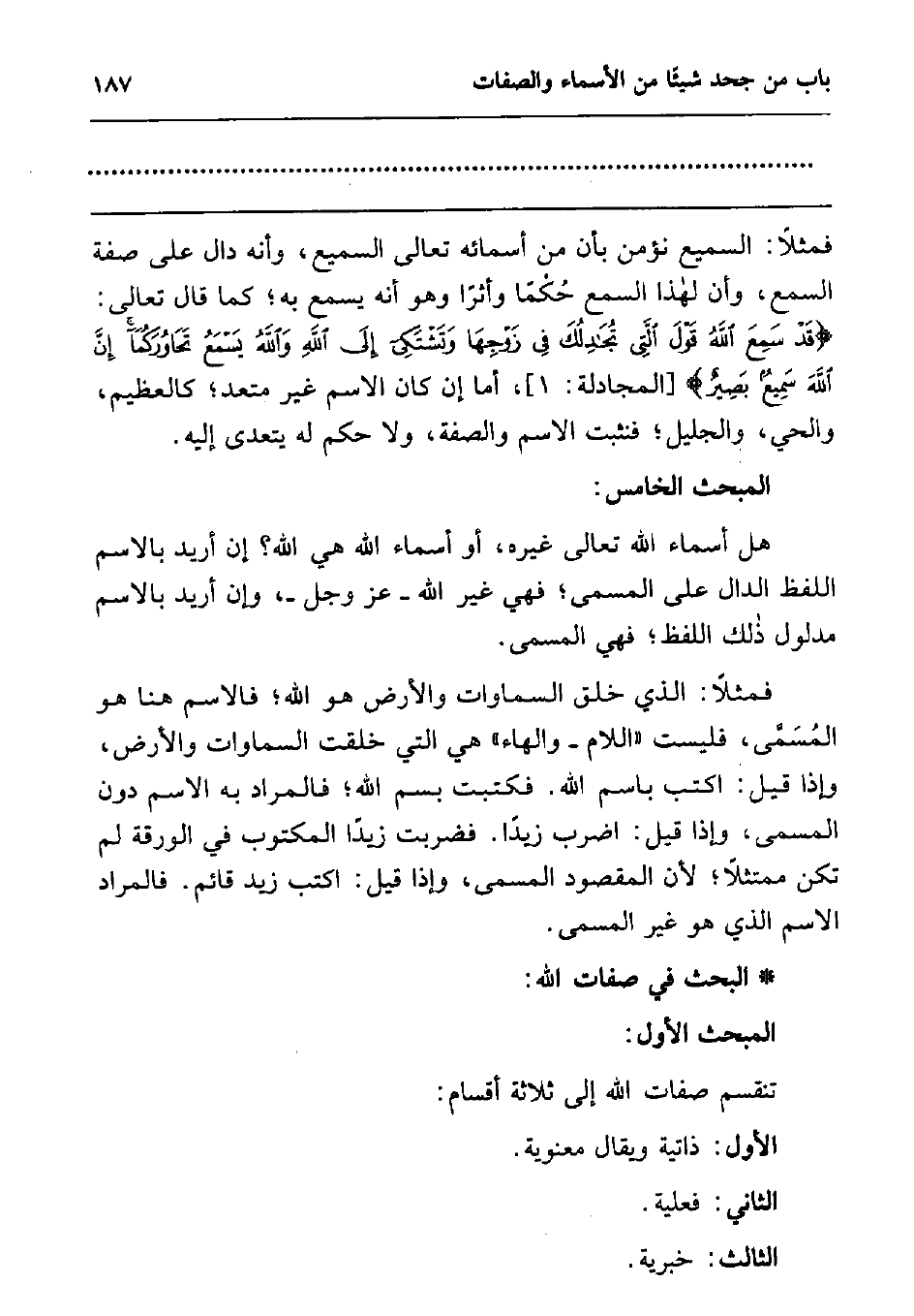 فمثلا: السميع نؤمن بأن من أسمائه تعالى السميع، وأنه دال على صفة السمع، وأن لهذا السمع حكما وأثرا وهو أنه يسمع به; كما قال تعالى: {قَدْ سَمِعَ اللَّهُ قَوْلَ الَّتِي تُجَادِلُكَ فِي زَوْجِهَا وَتَشْتَكِي إِلَى اللَّهِ وَاللَّهُ يَسْمَعُ تَحَاوُرَكُمَا إِنَّ اللَّهَ سَمِيعٌ بَصِيرٌ} ، [المجادلة:1] ، أما إن كان الاسم غير متعد; كالعظيم، والحي، والجليل; فنثبت الاسم والصفة، ولا حكم له يتعدى إليه.