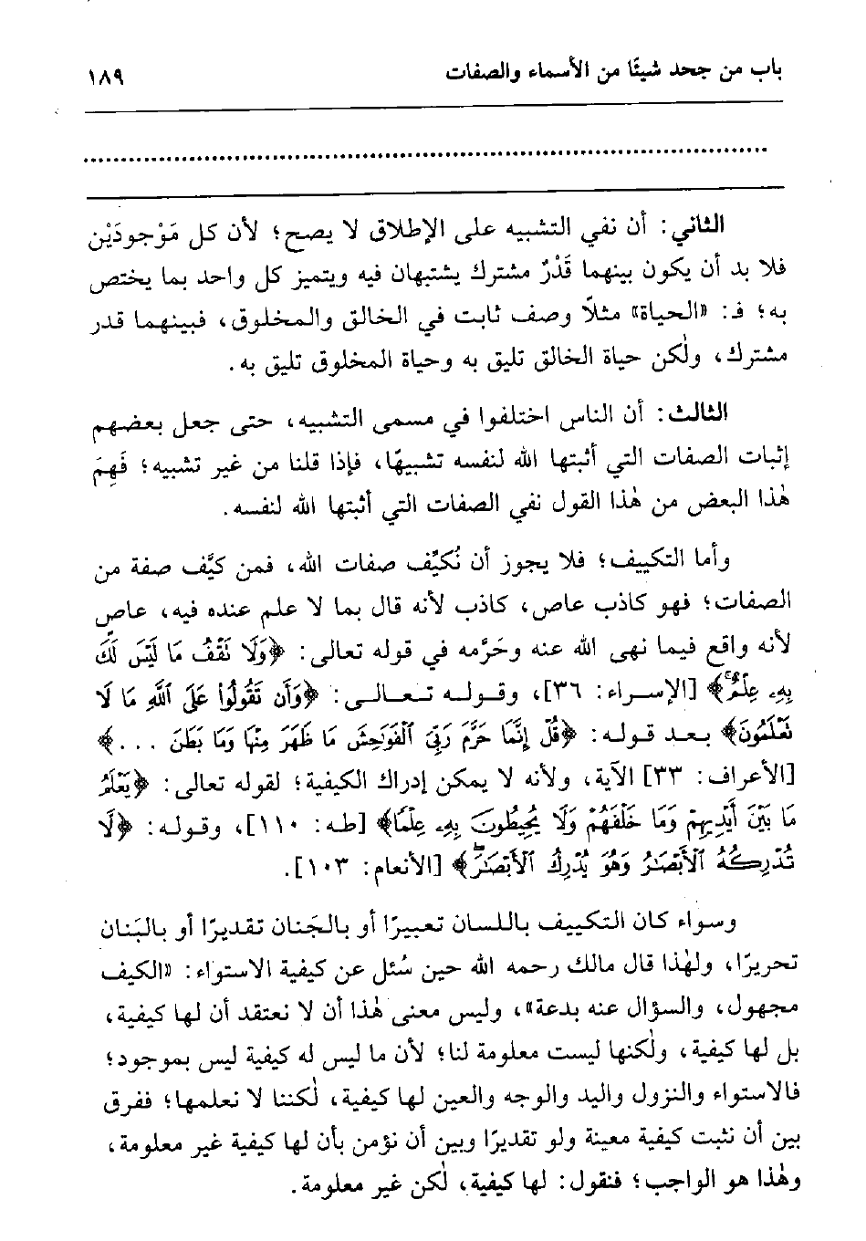 وسواء كان التكييف باللسان تعبيرا أو بالجنان تقديرا، أو بالبنان تحريرا، ولهذا قال مالك رحمه الله حين سئل عن كيفية الاستواء: "الكيف مجهول، والسؤال عنه بدعة"، وليس معنى هذا أن لا نعتقد أن لها كيفية، بل لها كيفية، ولكنها ليست معلومة لنا; لأن ما ليس له كيفية ليس بموجود; فالاستواء، والنزول، واليد، والوجه، والعين، لها كيفية، لكننا لا نعلمها; ففرق بين أن نثبت كيفية معينة ولو تقديرا، وبين أن نؤمن بأن لها كيفية غير معلومة، وهذا هو الواجب; فنقول: لها كيفية، لكن غير معلومة.