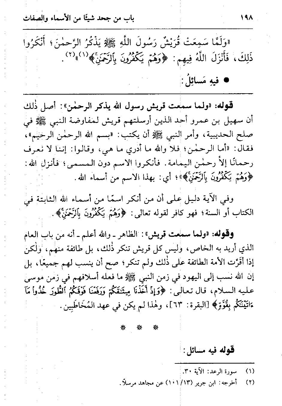 ولما سمعت قريش رسول الله صلى الله عليه وسلم يذكر الرحمن; أنكروا ذلك، فأنزل الله فيهم: {وَهُمْ يَكْفُرُونَ بِالرَّحْمَن} ، [الرعد: من الآية30] ،1.