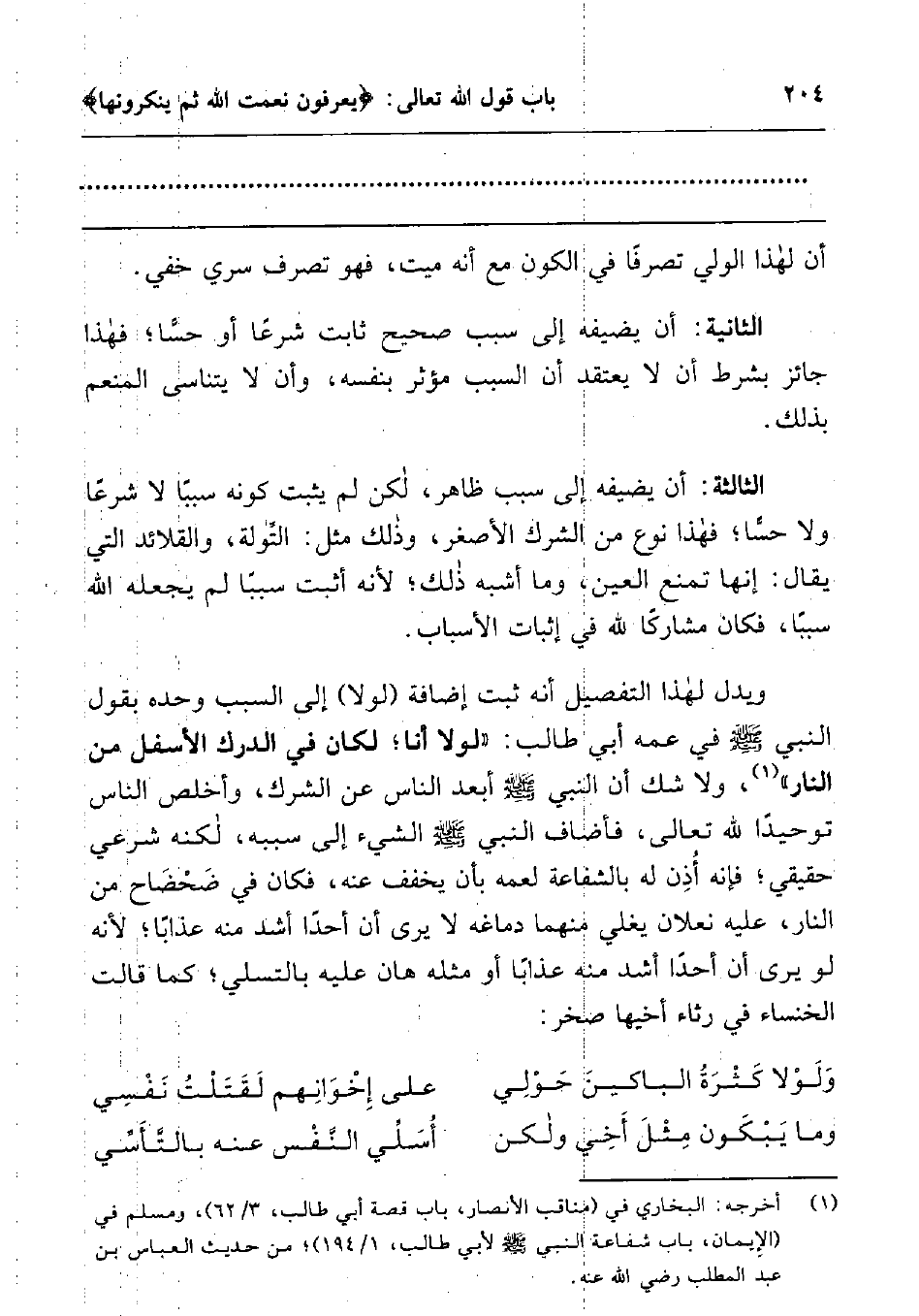 ويدل لهذا التفصيل أنه ثبت إضافة (لولا) إلى السبب وحده بقول النبي صلى الله عليه وسلم في عمه أبي طالب: " لولا أنا; لكان في الدرك الأسفل من النار "1، ولا شك أن النبي صلى الله عليه وسلم أبعد الناس عن الشرك، وأخلص الناس توحيدا لله تعالى، فأضاف النبي صلى الله عليه وسلم الشيء إلى سببه، لكنه شرعي حقيقي; فإنه أُذِن له بالشفاعة لعمه بأن يخفف عنه، فكان في ضَحْضَاح من النار، عليه نعلان يغلي منهما دماغه لا يرى أن أحدا أشد منه عذابا; لأنه لو يرى أن أحدا أشد منه عذابا أو مثله هان عليه بالتسلي; كما قالت الخنساء في رثاء أخيها صخر: