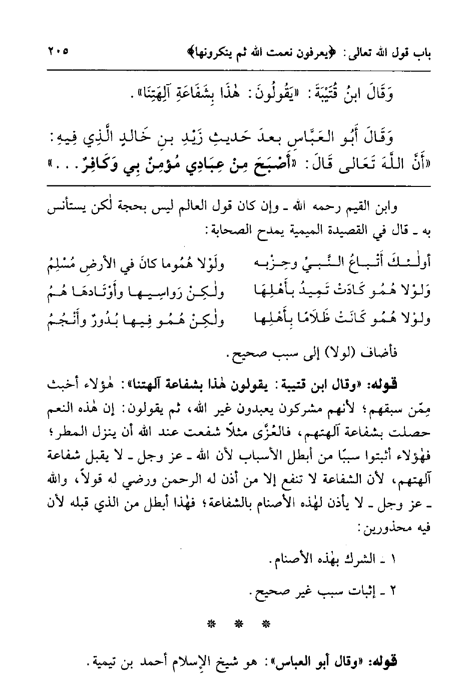 قوله: "وقال ابن قتيبة: يقولون هذا بشفاعة آلهتنا ": هؤلاء أخبث ممن سبقهم; لأنهم مشركون يعبدون غير الله، ثم يقولون: إن هذه النعم حصلت بشفاعة آلهتهم، فالعُزَّى مثلا شفعت عند الله أن ينزل المطر; فهؤلاء أثبتوا سببا من أبطل الأسباب لأن الله عز وجل لا يقبل شفاعة آلهتهم، لأن الشفاعة لا تنفع إلا من أذن له الرحمن ورضي له قولا، والله عز وجل لا يأذن لهذه الأصنام بالشفاعة; فهذا أبطل من الذي قبله لأن فيه محذورين: