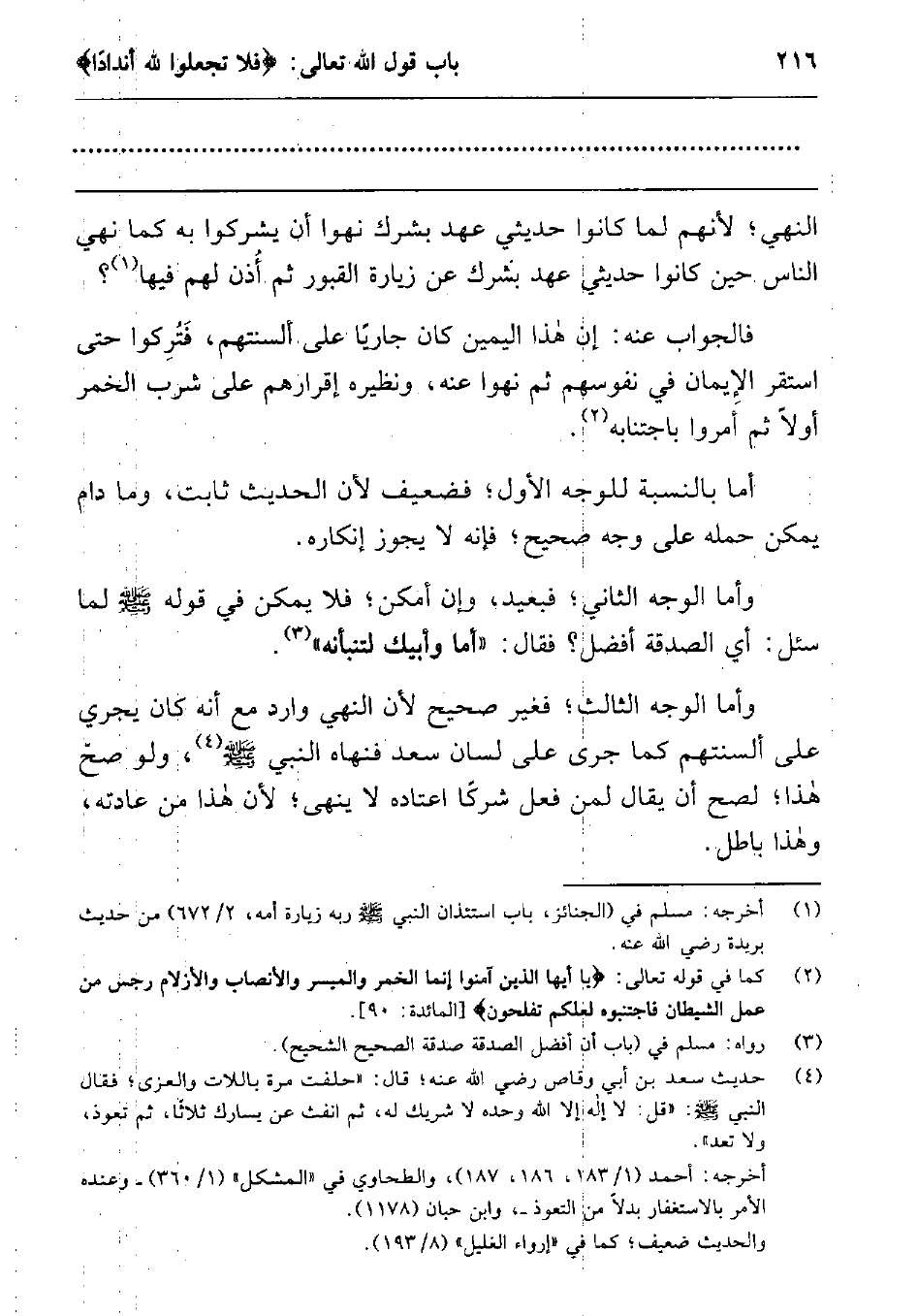 4حديث سعد بن أبي وقاص رضي الله عنه; قال: "حلفت مرة باللات والعزى; فقال النبي صلى الله عليه وسلم: قل: لا إله إلا الله وحده لا شريك له, ثم انفث عن يسارك ثلاثا, ثم تعوذ, ولا تعد. أخرجه: أحمد (1/ 183, 186, 187) , والطحاوي في "المشكل" (1/ 360) - وعنده الأمر بالاستغفار بدلا من التعوذ-, وابن حبان (1178) . والحديث ضعيف; كما في "إرواء الغليل" (8/193) .