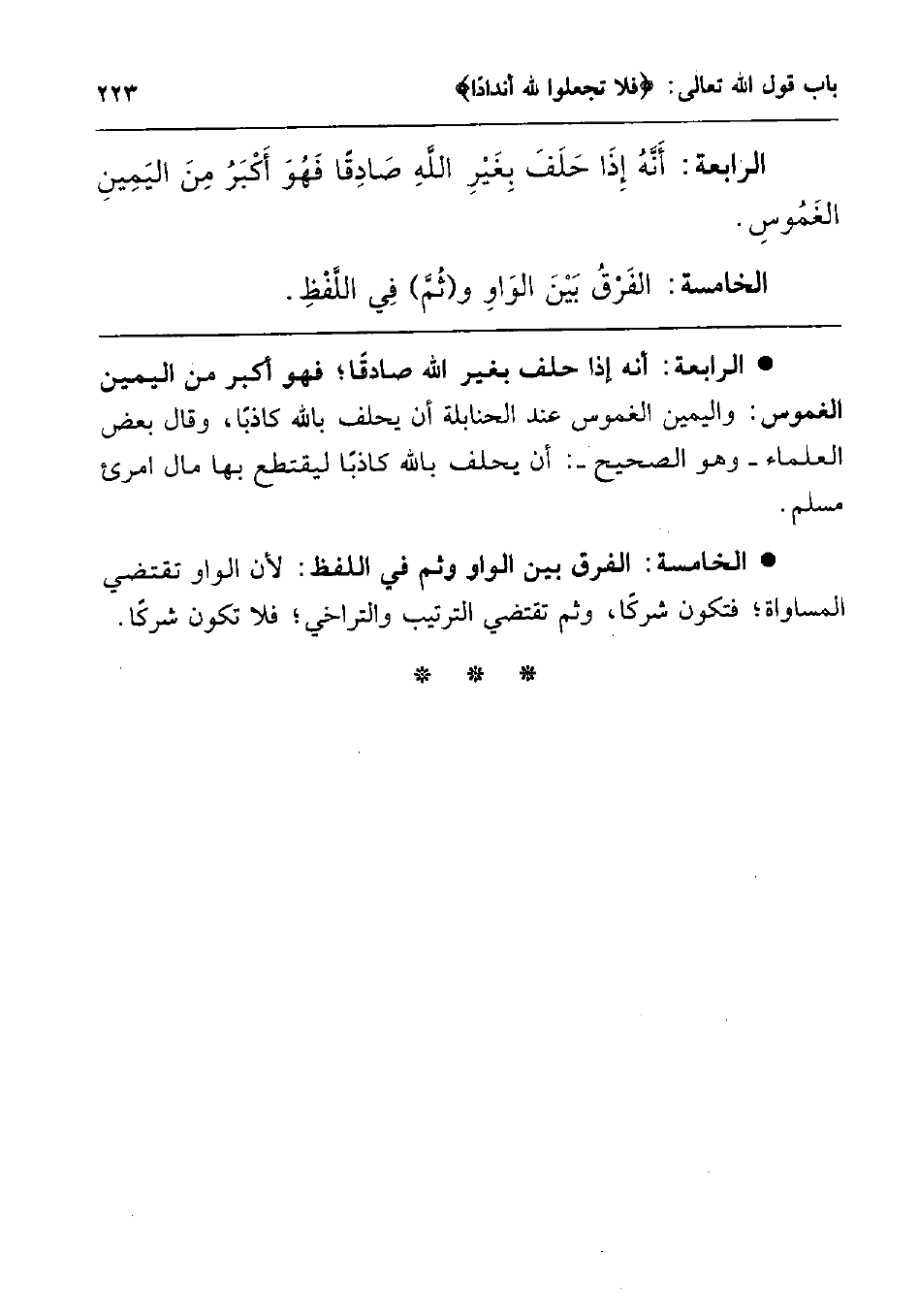 الخامسة: الفرق بين الواو وثم في اللفظ: لأن الواو تقتضي المساواة; فتكون شركا، وثم تقتضي الترتيب والتراخي; فلا تكون شركا.