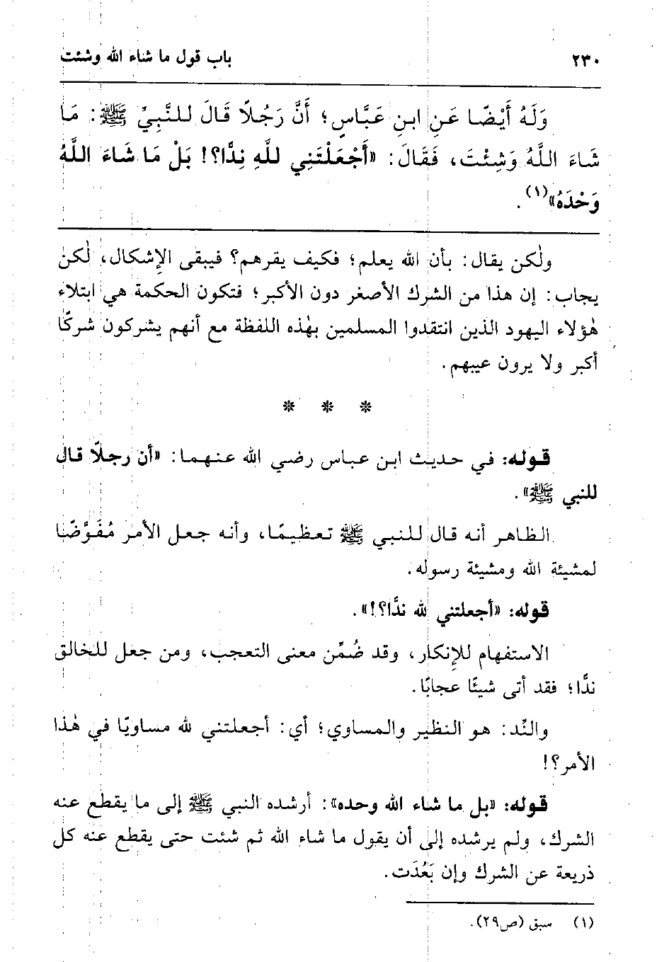 وله أيضا عن ابن عباس; أن رجلا قال للنبي صلى الله عليه وسلم: ما شاء الله وشئت، فقال: " أجعلتني لله ندا؟! بل ما شاء الله وحده "1.