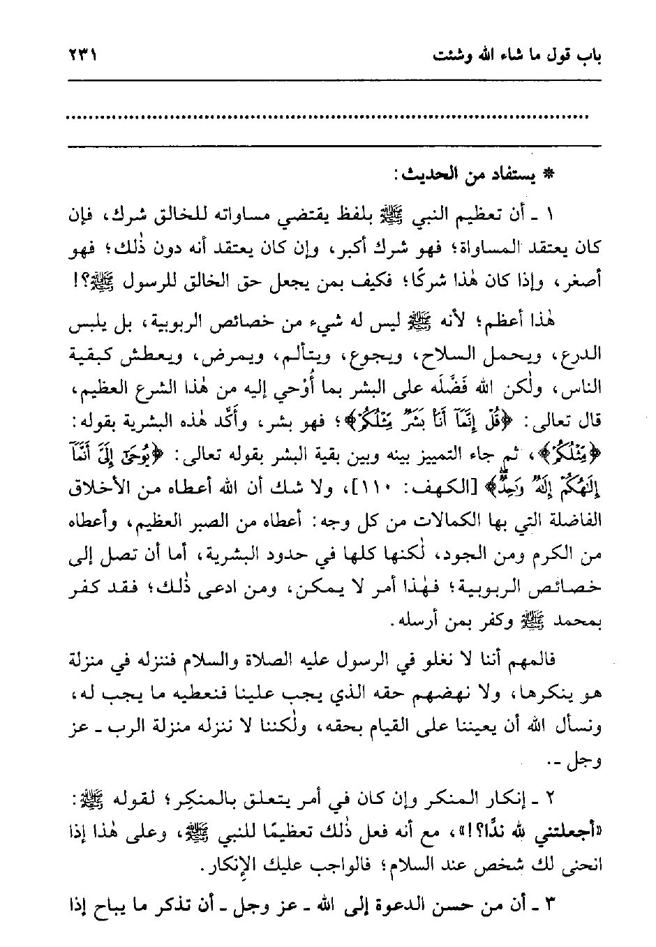 1- أن تعظيم النبي صلى الله عليه وسلم بلفظ يقتضي مساواته للخالق شرك، فإن كان يعتقد المساواة; فهو شرك أكبر، وإن كان يعتقد أنه دون ذلك; فهو أصغر، وإذا كان هذا شركا; فكيف بمن يجعل حق الخالق للرسول صلى الله عليه وسلم؟! هذا أعظم; لأنه صلى الله عليه وسلم ليس له شيء من خصائص الربوبية، بل يلبس الدرع، ويحمل السلاح، ويجوع، ويتألم، ويمرض، ويعطش كبقية الناس، ولكن الله فضَّله على البشر بما أوحي إليه من هذا الشرع العظيم، قال تعالى: {قُلْ إِنَّمَا أَنَا بَشَرٌ مِثْلُكُمْ} [الكهف: من الآية110] فهو بشر، وأكد هذه البشرية بقوله: (مثلكم) ، ثم جاء التمييز بينه وبين بقية البشر بقوله تعالى: {يُوحَى إِلَيَّ أَنَّمَا إِلَهُكُمْ إِلَهٌ وَاحِدٌ} [الكهف: من الآية110] ، ولا شك أن الله أعطاه من الأخلاق الفاضلة التي بها الكمالات من كل وجه؛ أعطاه من الصبر العظيم، وأعطاه من الكرم ومن الجود، لكنها كلها في حدود البشرية، أما أن تصل إلى خصائص الربوبية; فهذا أمر لا يمكن، ومن ادعى ذلك; فقد كفر بمحمد صلى الله عليه وسلم وكفر بمن أرسله.
