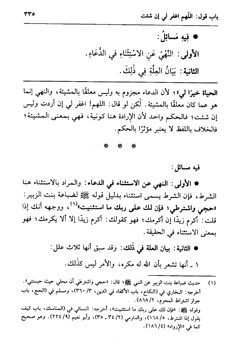 الأولى: النهي عن الاستثناء في الدعاء: والمراد بالاستثناء هنا الشرط، فإن الشرط يسمى استثناء بدليل قوله صلى الله عليه وسلم لضباعة بنت الزبير: " حجي واشترطي; فإن لك على ربك ما استثنيت "1 ووجهه أنك إذا قلت: أكرم زيدا إن أكرمك; فهو كقولك: أكرم زيدا إلا ألا يكرمك; فهو بمعنى الاستثناء في الحقيقة.