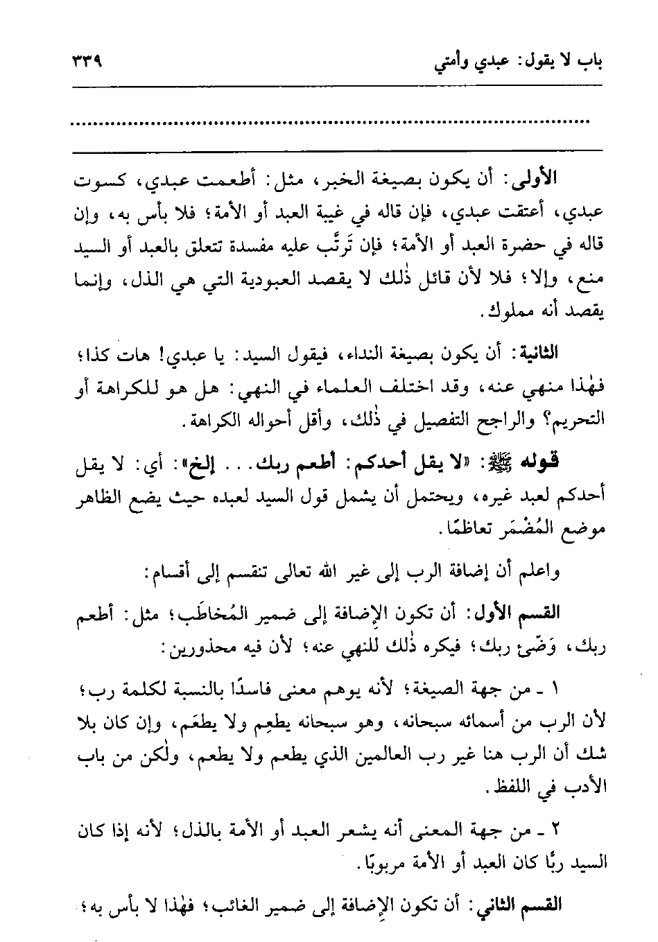 الأولى: أن يكون بصيغة الخبر، مثل: أطعمت عبدي، كسوت عبدي، أعتقت عبدي، فإن قاله في غيبة العبد أو الأمة; فلا بأس به، وإن قاله في حضرة العبد أو الأمة; فإن ترتب عليه مفسدة تتعلق بالعبد أو السيد منع، وإلا; فلا لأن قائل ذلك لا يقصد العبودية التي هي الذل، وإنما يقصد أنه مملوك.