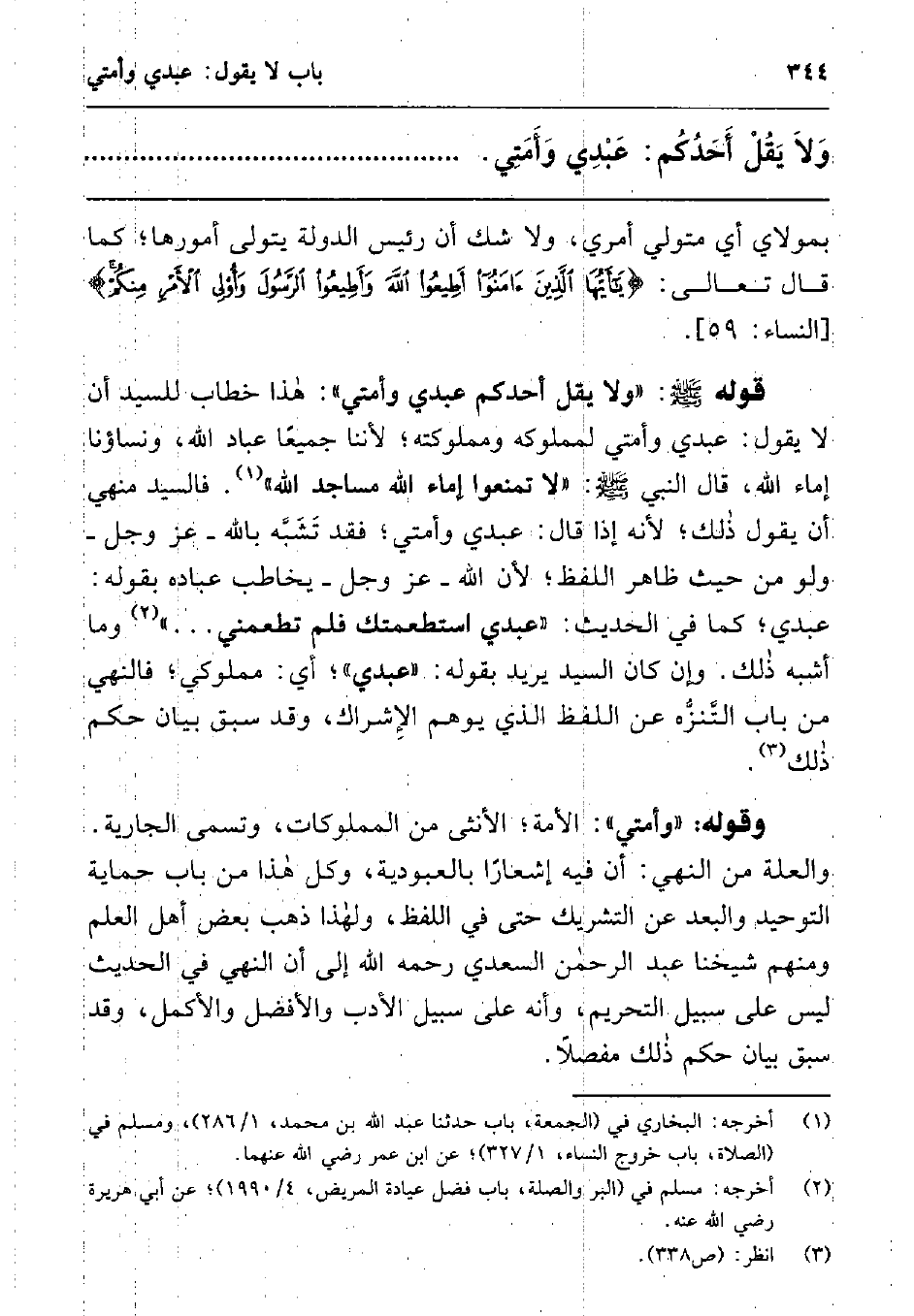 قوله صلى الله عليه وسلم: " ولا يقل أحدكم عبدي وأمتي "2 هذا خطاب للسيد أن لا يقول: عبدي وأمتي لمملوكه ومملوكته; لأننا جميعا عباد الله، ونساؤنا إماء الله، قال النبي صلى الله عليه وسلم "لا تمنعوا إماء الله مساجد الله"3 فالسيد منهي أن يقول ذلك، لأنه إذا قال: عبدي وأمتي فقد تشبه بالله عز وجل، ولو من حيث ظاهر اللفظ; لأن الله عز وجل يخاطب عباده بقوله: عبدي، كما في الحديث: " عبدي استطعمتك فلم تطعمني ... "4 وما أشبه ذلك.