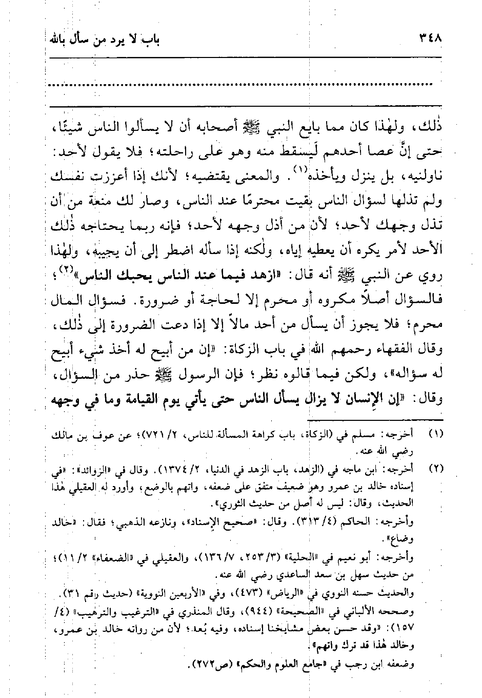 ذلك، ولهذا كان مما بايع النبي صلى الله عليه وسلم أصحابه أن لا يسألوا الناس شيئا، حتى إن عصا أحدهم ليسقط منه وهو على راحلته; فلا، يقول لأحد: ناولنيه، بل ينزل ويأخذه1. والمعنى يقتضيه; لأنك إذا أعززت نفسك ولم تذلها لسؤال الناس بقيت محترما عند الناس، وصار لك منعة من أن تذل وجهك لأحد; لأن من أذل وجهه لأحد; فإنه ربما يحتاجه ذلك الأحد لأمر يكره أن يعطيه إياه، ولكنه إذا سأله اضطر إلى أن يجيبه، ولهذا روي عن النبي صلى الله عليه وسلم أنه قال: " ازهد فيما عند الناس يحبك الناس "2 فالسؤال أصلا مكروه أو محرم إلا لحاجة أو ضرورة. فسؤال المال محرم، فلا يجوز أن يسأل من أحد مالا إلا إذا دعت الضرورة إلى ذلك، وقال الفقهاء رحمهم الله في باب الزكاة: "إن من أبيح له أخذ شيء أبيح له سؤاله"، ولكن فيما قالوه نظر; فإن الرسول صلى الله عليه وسلم حذر من السؤال، وقال: "إن الإنسان لا يزال يسأل الناس حتى يأتي يوم القيامة وما في وجهه