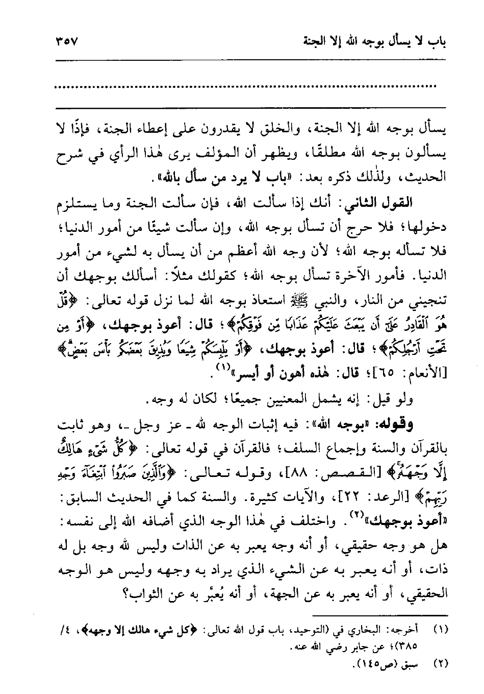 القول الثاني: أنك إذا سألت الله، فإن سألت الجنة وما يستلزم دخولها; فلا حرج أن تسأل بوجه الله، وإن سألت شيئا من أمور الدنيا; فلا تسأله بوجه الله; لأن وجه الله أعظم من أن يسأل به لشيء من أمور الدنيا. فأمور الآخرة تسأل بوجه الله; كقولك مثلا: أسألك بوجهك أن تنجيني من النار، والنبي صلى الله عليه وسلم استعاذ بوجه الله لما نزل قوله تعالى: {قُلْ هُوَ الْقَادِرُ عَلَى أَنْ يَبْعَثَ عَلَيْكُمْ عَذَاباً مِنْ فَوْقِكُمْ} 1 قال: أعوذ بوجهك، {مِنْ تَحْتِ أَرْجُلِكُمْ} 2 قال: أعوذ بوجهك، {أَوْ يَلْبِسَكُمْ شِيَعاً وَيُذِيقَ بَعْضَكُمْ بَأْسَ بَعْضٍ} 3 قال: "هذه أهون أو أيسر"45.