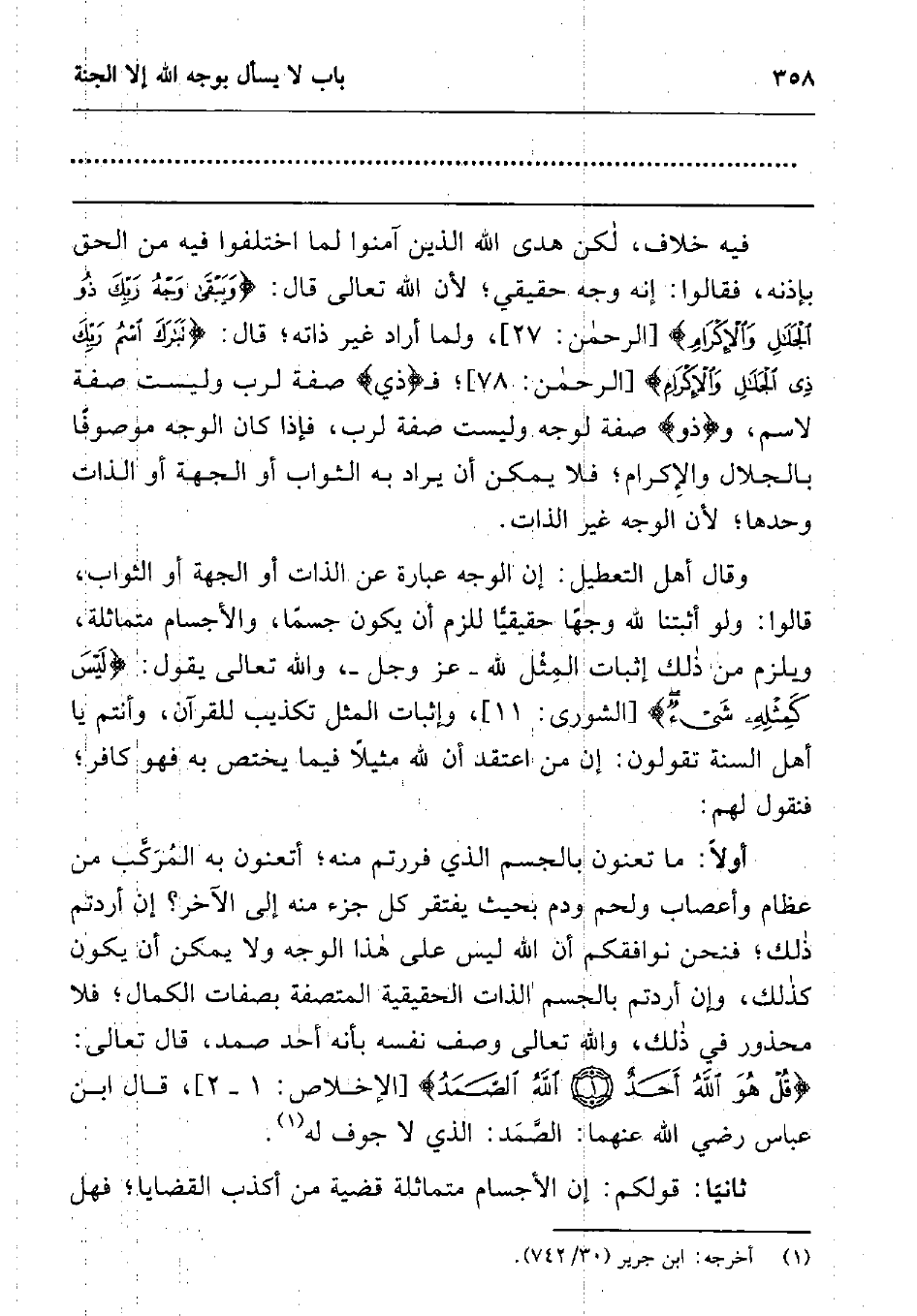 فيه خلاف، لكن هدى الله الذين آمنوا لما اختلفوا فيه من الحق بإذنه، فقالوا: إنه وجه حقيقي; لأن الله تعالى قال: {وَيَبْقَى وَجْهُ رَبِّكَ ذُو الْجَلالِ وَالأِكْرَامِ} 1 ولما أراد غير ذاته; قال: " {تَبَارَكَ اسْمُ رَبِّكَ ذِي الْجَلالِ وَالأِكْرَامِ} 2 ف (ذي) صفة لرب وليست صفة لاسم، و (ذو) صفة لوجه وليست صفة لرب، فإذا كان الوجه موصوفا بالجلال والإكرام; فلا يمكن أن يراد به الثواب أو الجهة أو الذات وحدها; لأن الوجه غير الذات..