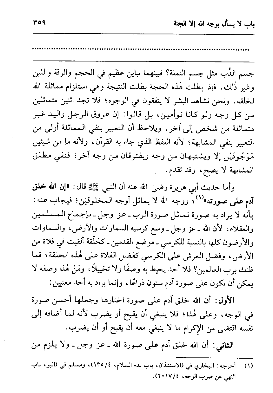 وأما حديث أبي هريرة رضي الله عنه أن النبي صلى الله عليه وسلم قال: " إن الله خلق آدم على صورته "1 ووجه الله لا يماثل أوجه المخلوقين، فيجاب عنه: بأنه لا يراد به صورة تماثل صورة الرب عز وجل بإجماع المسلمين والعقلاء، لأن الله عز وجل وسع كرسيه السماوات والأرض، والسماوات والأرضون كلها بالنسبة للكرسي -موضع القدمين- كحلقة ألقيت في فلاة من الأرض، وفضل العرش على الكرسي كفضل الفلاة على هذه الحلقة; فما ظنك برب العالمين؟ فلا أحد يحيط به وصفا ولا تخييلا، ومن هذا وصفه لا يمكن أن يكون على صورة آدم ستون ذراعا، وإنما يراد به أحد معنيين:
