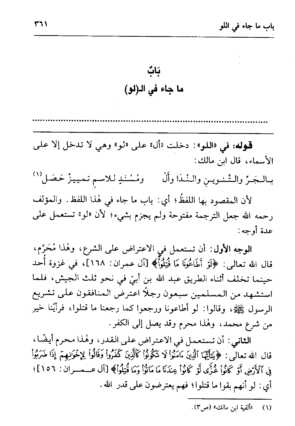 لأن المقصود بها اللفظ; أي: باب ما جاء في هذا اللفظ. والمؤلف رحمه الله جعل الترجمة مفتوحة ولم يجزم بشيء; لأن "لو" تستعمل على عدة أوجه: