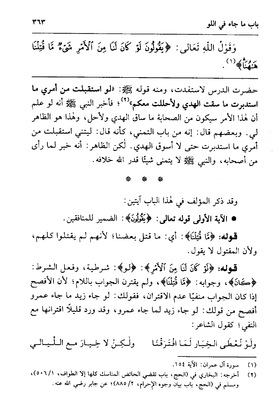 وقول الله تعالى: {يَقُولُونَ لَوْ كَانَ لَنَا مِنَ الْأَمْرِ شَيْءٌ مَا قُتِلْنَا هَاهُنَا} 1.
