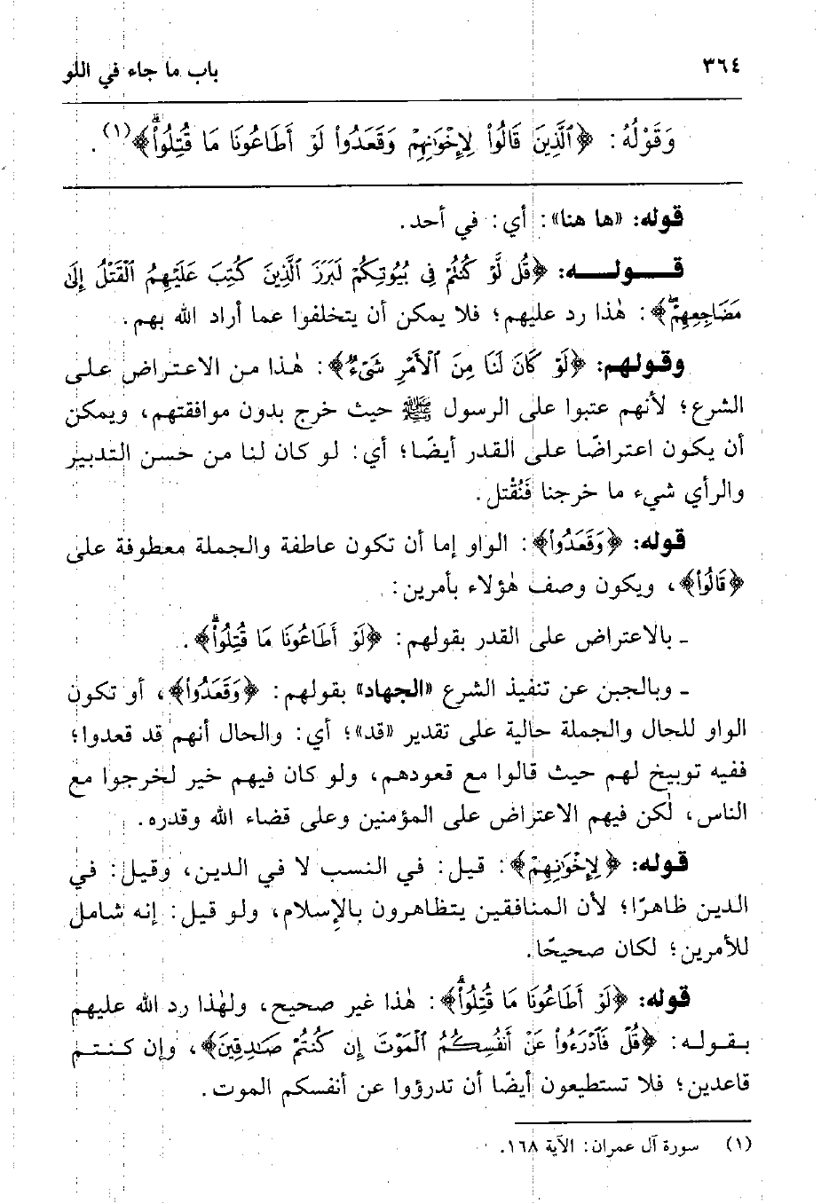 وقوله: {الَّذِينَ قَالُوا لإِخْوَانِهِمْ وَقَعَدُوا لَوْ أَطَاعُونَا مَا قُتِلُوا} 1.