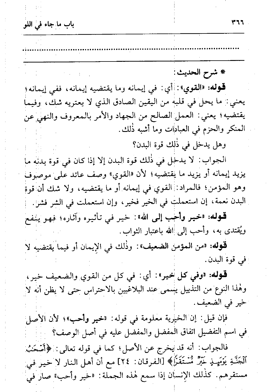 الجواب: لا يدخل في ذلك قوة البدن إلا إذا كان في قوة بدنه ما يزيد إيمانه، أو يزيد ما يقتضيه; لأن "القوي" وصف عائد على موصوف وهو المؤمن; فالمراد: القوي في إيمانه أو ما يقتضيه، ولا شك أن قوة البدن نعمة، إن استعملت في الخير فخير، وإن استعملت في الشر فشر.