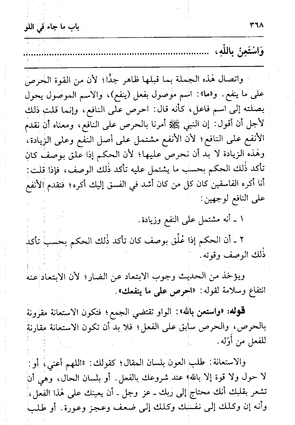 واتصال هذه الجملة بما قبلها ظاهر جدا; لأن من القوة الحرص على ما ينفع. و"ما": اسم موصول بفعل (ينفع) ، والاسم الموصول يحول بصلته إلى اسم فاعل، كأنه قال: احرص على النافع، وإنما قلت ذلك لأجل أن أقول: إن النبي صلى الله عليه وسلم أمرنا بالحرص على النافع، ومعناه أن نقدم الأنفع على النافع; لأن الأنفع مشتمل على أصل النفع وعلى الزيادة، وهذه الزيادة لا بد أن نحرص عليها; لأن الحكم إذا علق بوصف كان تأكد ذلك الحكم بحسب ما يشتمل عليه تأكد ذلك الوصف، فإذا قلت: أنا أكره الفاسقين كان كل من كان أشد في الفسق إليك أكره; فنقدم الأنفع على النافع لوجهين: