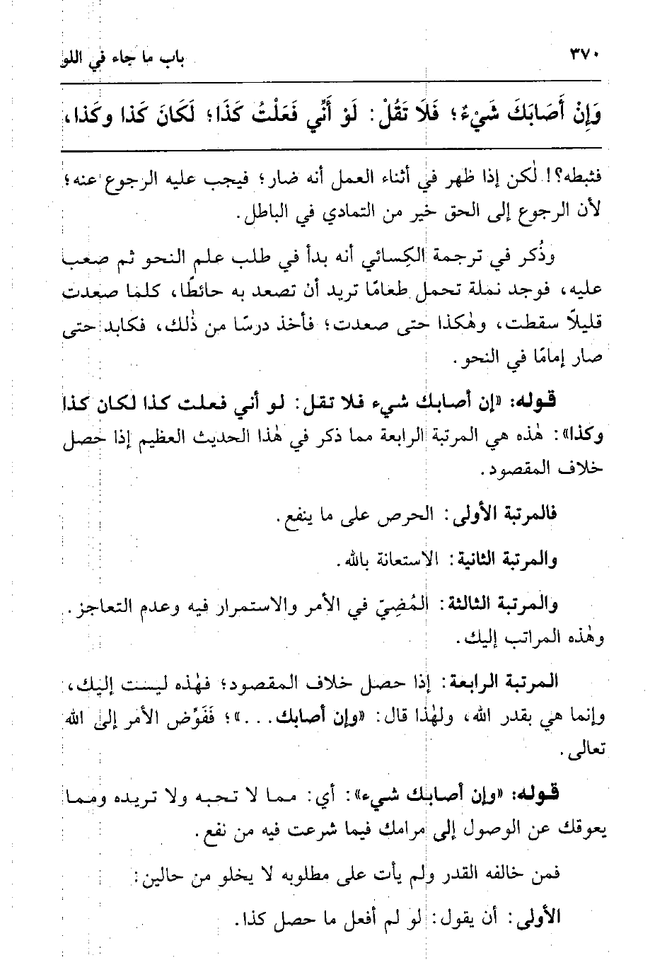 قوله: " إن أصابك شيء فلا تقل: لو أني فعلت كذا لكان كذا وكذا "1 هذه هي المرتبة الرابعة مما ذكر في هذا الحديث العظيم إذا حصل خلاف المقصود.