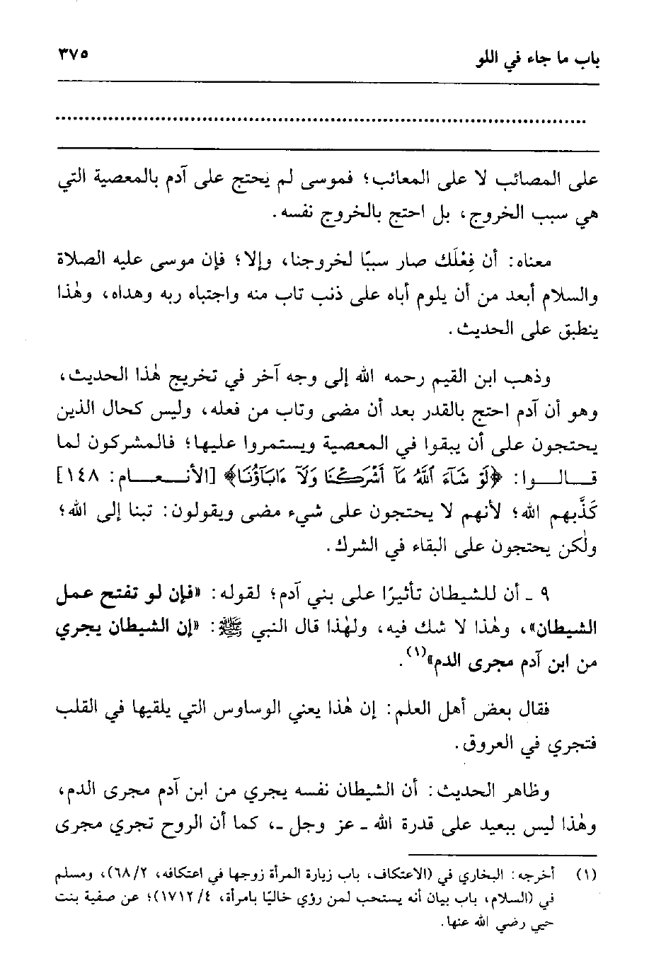وظاهر الحديث: أن الشيطان نفسه يجري من ابن آدم مجرى الدم، وهذا ليس ببعيد على قدرة الله عز وجل، كما أن الروح تجري مجرى الدم،