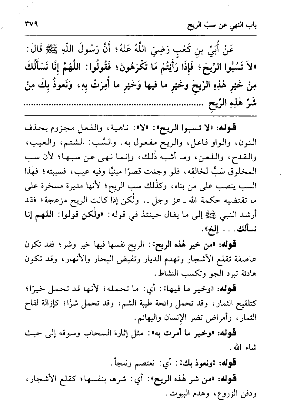 عن أبي بن كعب رضي الله عنه أن رسول الله صلى الله عليه وسلم قال: " لا تسبوا الريح; فإذا رأيتم ما تكرهون; فقولوا: اللهم إنا نسألك من خير هذه الريح، وخير ما فيها، وخير ما أمرت به، ونعوذ بك من شر هذه الريح..................