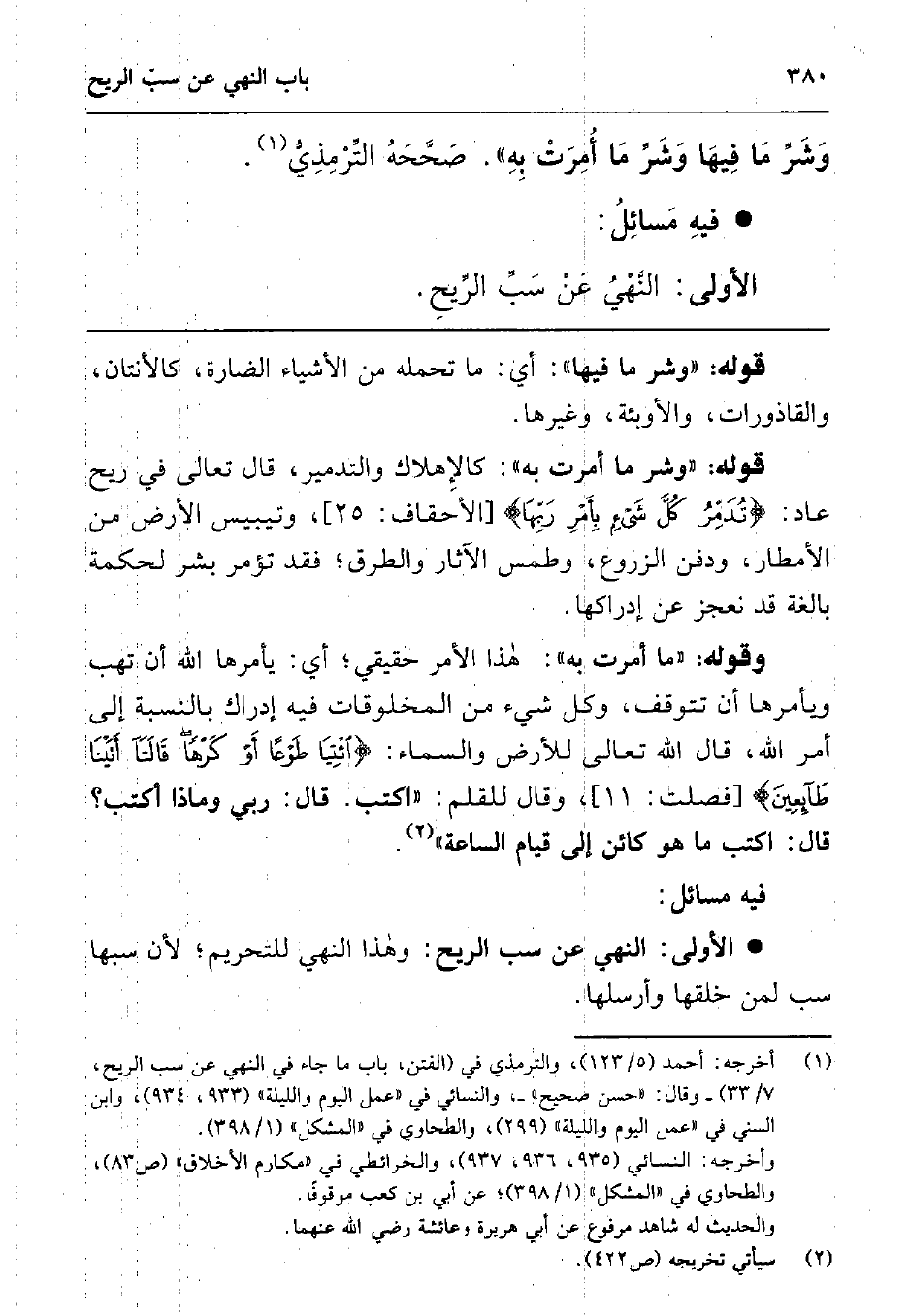 1 أخرجه: أحمد (5/123) , والترمذي في (الفتن, باب ما جاء في النهي عن سب الريح, 7/33) - وقال: "حسن صحيح" -, والنسائي في "عمل اليوم والليلة" (933, 934) , وابن السني في "عمل اليوم والليلة" (299) , والطحاوي في "المشكل" (1/398) . وأخرجه: النسائي (935, 936, 937) , والخرائطي في (مكارم الأخلاق" (ص 83) , والطحاوي في "المشكل" (1/398) ; عن أبي بن كعب موقوفا. والحديث له شاهد مرفوع عن أبي هريرة وعائشة رضي الله عنهما.
