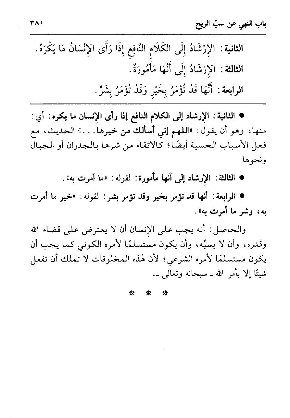 الثانية: الإرشاد إلى الكلام النافع إذا رأى الإنسان ما يكره: أي: منها، وهو أن يقول: " اللهم إني أسألك من خيرها ... " الحديث، مع فعل الأسباب الحسية أيضا; كالاتقاء من شرها بالجدران أو الجبال ونحوها.