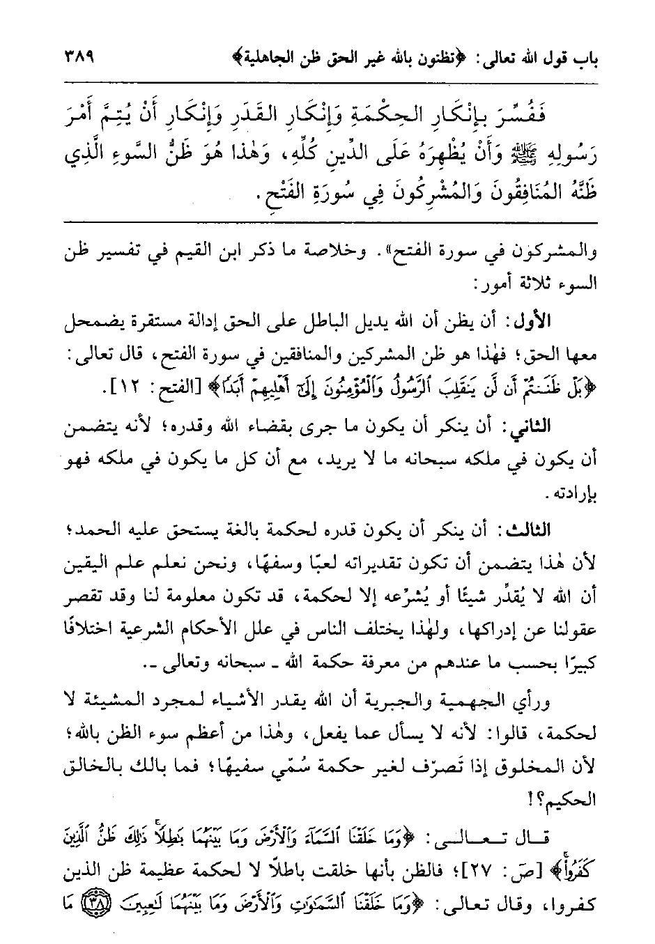 والمشركون في سورة الفتح". وخلاصة ما ذكر ابن القيم في تفسير ظن السوء ثلاثة أمور: