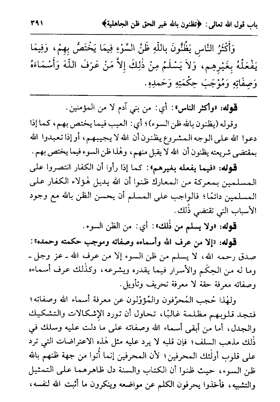 ولهذا حُجب المحرِّفون والمؤوّلون عن معرفة أسماء الله وصفاته; فتجد قلوبهم مظلمة غالبا، تحاول أن تورد الإشكالات والتشكيك والجدل، أما من أبقى أسماء الله وصفاته على ما دلت عليه، وسلك في ذلك مذهب السلف، فإن قلبه لا يرد عليه مثل هذه الاعتراضات التي ترد على قلوب أولئك المحرفين; لأن المحرفين إنما أتوا من جهة ظنهم بالله ظن السوء، حيث ظنوا أن الكتاب والسنة دل ظاهرهما على التمثيل والتشبيه، فأخذوا يحرفون الكلم عن مواضعه وينكرون ما أثبت الله لنفسه،