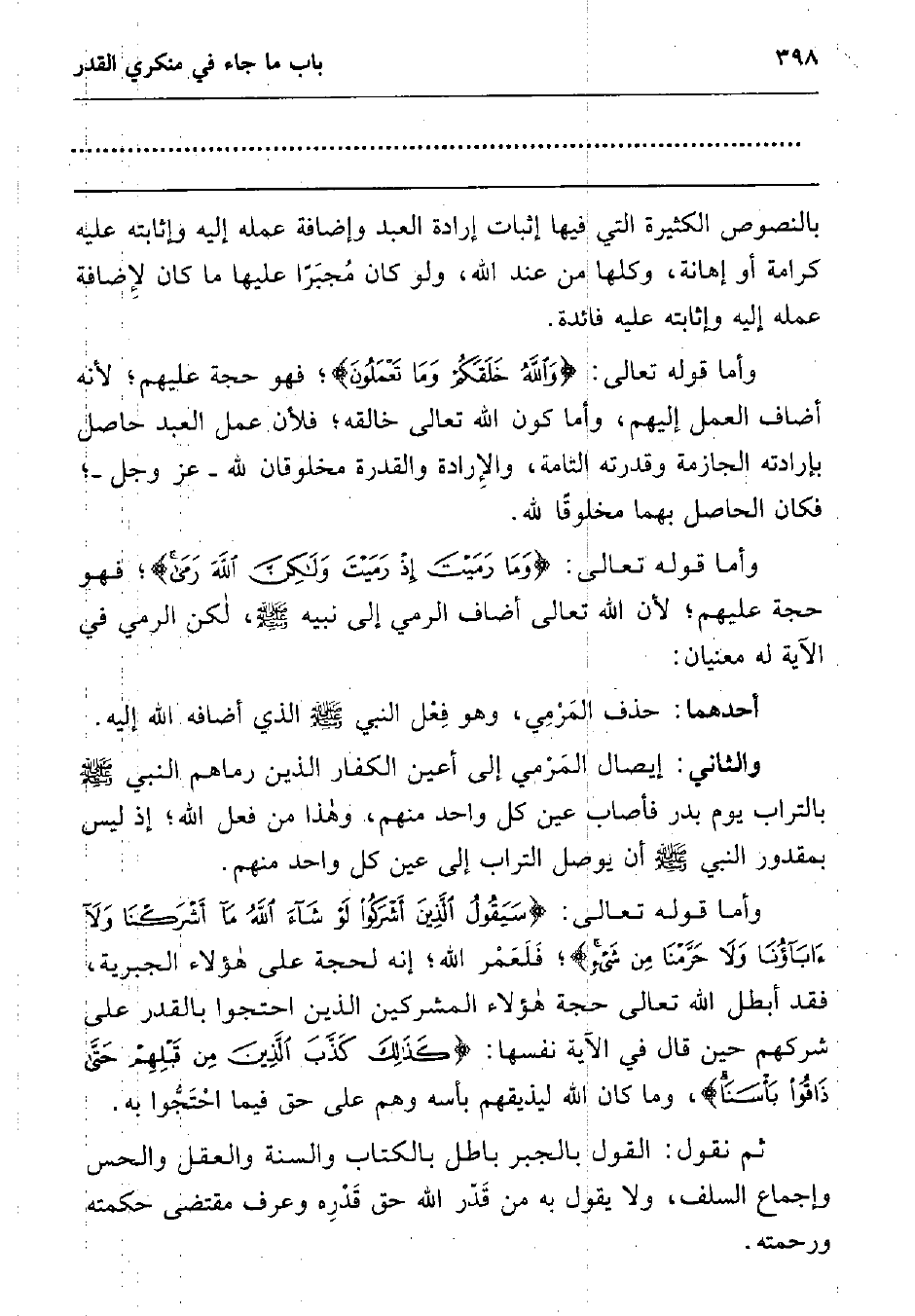 وأما قوله تعالى: {سَيَقُولُ الَّذِينَ أَشْرَكُوا لَوْ شَاءَ اللَّهُ مَا أَشْرَكْنَا وَلا آبَاؤُنَا وَلا حَرَّمْنَا مِنْ شَيْءٍ} 3 فلعمر الله; إنه لحجة على هؤلاء الجبرية، فقد أبطل الله تعالى حجة هؤلاء المشركين الذين احتجوا بالقدر على شركهم حين قال في الآية نفسها: {كَذَلِكَ كَذَّبَ الَّذِينَ مِنْ قَبْلِهِمْ حَتَّى ذَاقُوا بَأْسَنَا} 4 وما كان الله ليذيقهم بأسه وهم على حق فيما احتجوا به.