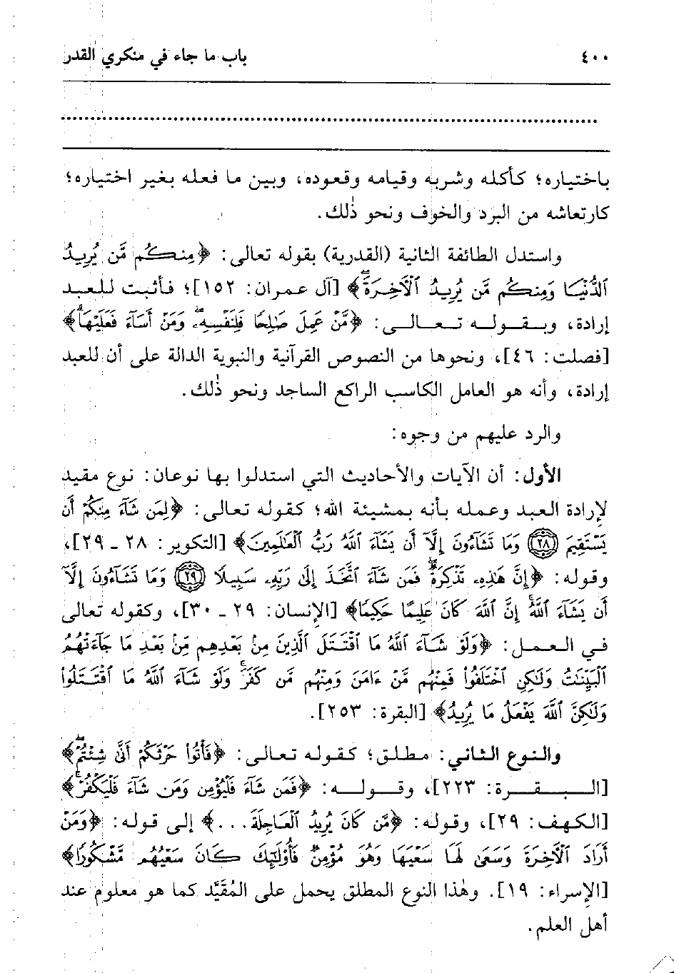 الأول: أن الآيات والأحاديث التي استدلوا بها نوعان: نوع مقيد لإرادة العبد وعمله بأنه بمشيئة الله; كقوله تعالى: {لِمَنْ شَاءَ مِنْكُمْ أَنْ يَسْتَقِيمَ وَمَا تَشَاءُونَ إِلا أَنْ يَشَاءَ اللَّهُ رَبُّ الْعَالَمِينَ} 3 وقوله: {إِنَّ هَذِهِ تَذْكِرَةٌ فَمَنْ شَاءَ اتَّخَذَ إِلَى رَبِّهِ سَبِيلاً وَمَا تَشَاءُونَ إِلا أَنْ يَشَاءَ اللَّهُ إِنَّ اللَّهَ كَانَ عَلِيماً حَكِيماً} 4 وكقوله تعالى في العمل: {وَلَوْ شَاءَ اللَّهُ مَا اقْتَتَلَ الَّذِينَ مِنْ بَعْدِهِمْ مِنْ بَعْدِ مَا جَاءَتْهُمُ الْبَيِّنَاتُ وَلَكِنِ اخْتَلَفُوا فَمِنْهُمْ مَنْ آمَنَ وَمِنْهُمْ مَنْ كَفَرَ وَلَوْ شَاءَ اللَّهُ مَا اقْتَتَلُوا وَلَكِنَّ اللَّهَ يَفْعَلُ مَا يُرِيدُ} 5.