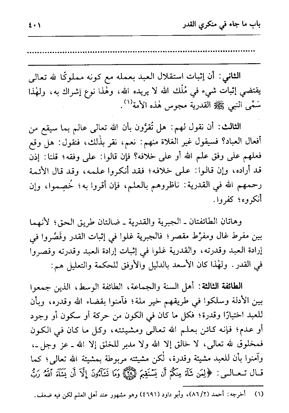 الثاني: أن إثبات استقلال العبد بعمله مع كونه مملوكا لله تعالى يقتضي إثبات شيء في ملك الله لا يريده الله، وهذا نوع إشراك به، ولهذا سمى النبي صلى الله عليه وسلم القدرية مجوس هذه الأمة1.