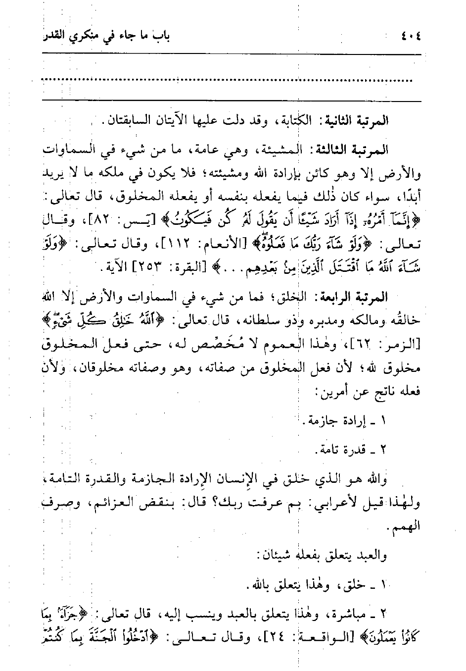 المرتبة الثالثة: المشيئة، وهي عامة، ما من شيء في السماوات والأرض إلا وهو كائن بإرادة الله ومشيئته; فلا يكون في ملكه ما لا يريد أبدا، سواء كان ذلك فيما يفعله بنفسه أو يفعله المخلوق، قال تعالى: {إِنَّمَا أَمْرُهُ إِذَا أَرَادَ شَيْئاً أَنْ يَقُولَ لَهُ كُنْ فَيَكُونُ} 1 وقال تعالى: {وَلَوْ شَاءَ رَبُّكَ مَا فَعَلُوهُ} 2 وقال تعالى: {وَلَوْ شَاءَ اللَّهُ مَا اقْتَتَلَ الَّذِينَ مِنْ بَعْدِهِمْ} 3 الآية.