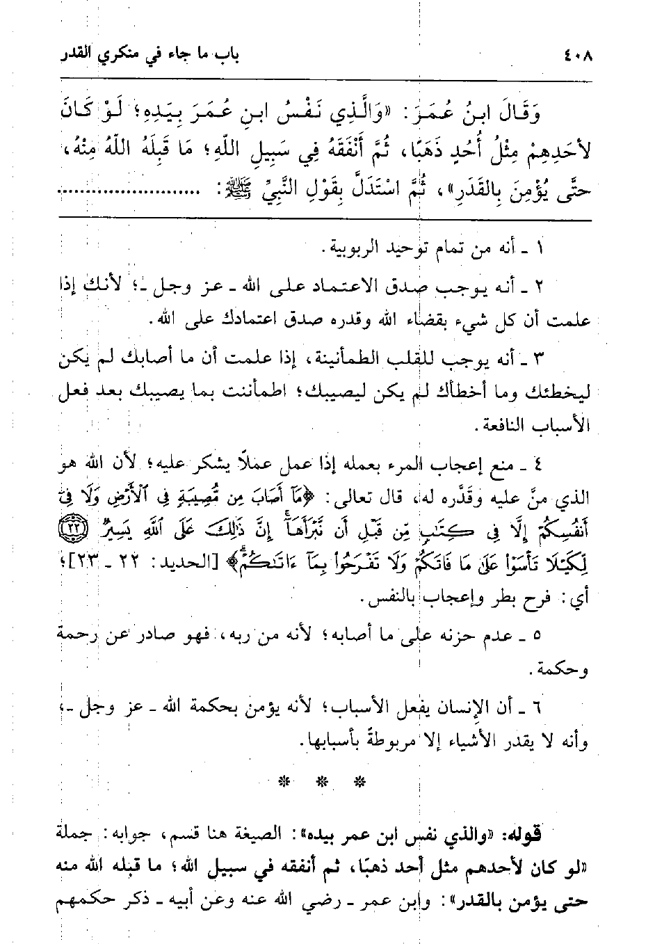 وقال ابن عمر: "والذي نفس ابن عمر بيده; لو كان لأحدهم مثل أحد ذهبا، ثم أنفقه في سبيل الله; ما قبله الله منه، حتى يؤمن بالقدر" ثم استدل بقول النبي صلى الله عليه وسلم:.................................................